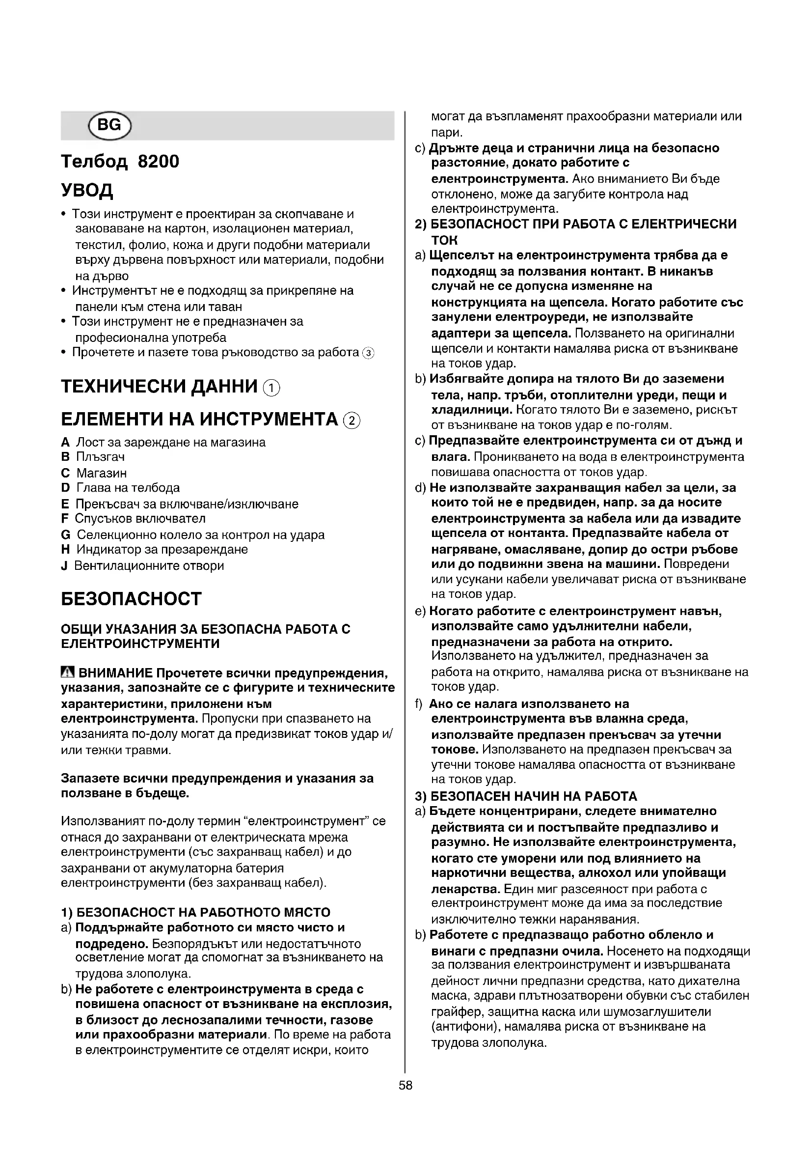 - Прочетете и пазете това ръководство за работа 3 ТЕXHИЧЕСКИ ДАННИ 1 ЕЛЕМЕНТИ НА ИНСТРУМЕНТА 2 A Лост за зареждане на магазина B Плъзгач C Магазин D Глава на телбода E Прекъсвач за включване/изключване F Спусъков включвател G Селекционно колело за контрол на удара H Индикатор за презареждане J Вентилационните отвоpи БЕЗОПАСНОСТ ОБЩИ УКАЗАНИЯ ЗА БЕЗОПАСНА РАБОТА С ЕЛЕКТРОИНСТРУМЕНТИ ВНИМАНИЕ Прочетете всички предупреждения, указания, запознайте се с фигурите и техническите характеристики, приложени към електроинструмента. Пропуски при спазването на указанията по-долу могат да предизвикат токов удар и/ или тежки травми. Запазете всички предупреждения и указания за ползване в бъдеще. Използваният по-долу термин “електроинструмент” се отнася до захранвани от електрическата мрежа електроинструменти (със захранващ кабел) и до захранвани от акумулаторна батерия електроинструменти (без захранващ кабел).