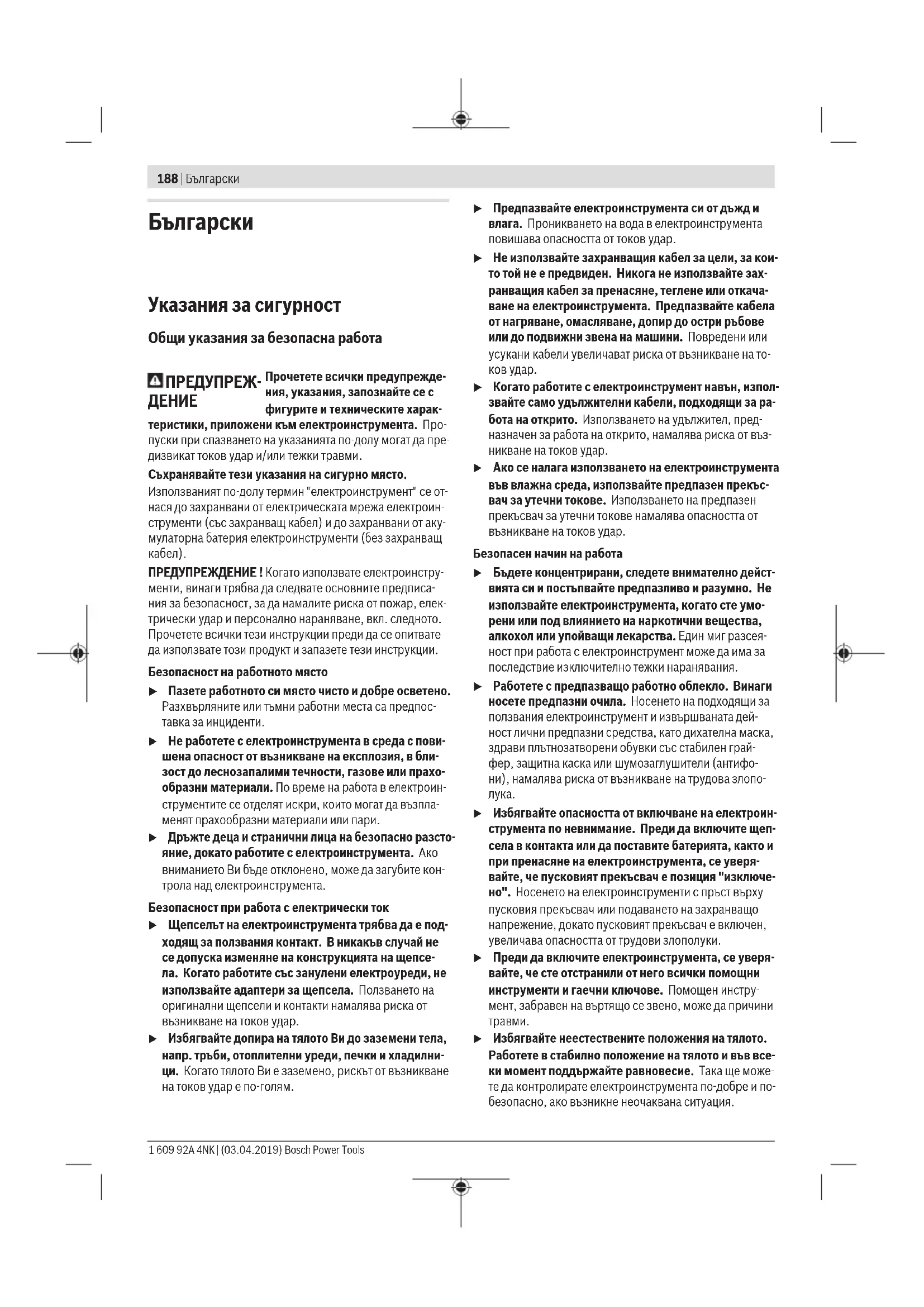 ПРЕДУПРЕЖДЕНИЕ ! Когато използвате електроинстру- менти, винаги трябва да следвате основните предписа- ния за безопасност, за да намалите риска от пожар, елек- трически удар и персонално нараняване, вкл. следното. Прочетете всички тези инструкции преди да се опитвате да използвате този продукт и запазете тези инструкции. Безопасност на работното място u Пазете работното си място чисто и добре осветено. Разхвърляните или тъмни работни места са предпос- тавка за инциденти. u Не работете с електроинструмента в среда с пови- шена опасност от възникване на експлозия, в бли- зост до леснозапалими течности, газове или прахо- образни материали. По време на работа в електроин- струментите се отделят искри, които могат да възпла- менят прахообразни материали или пари. u Дръжте деца и странични лица на безопасно разсто- яние, докато работите с електроинструмента. Ако вниманието Ви бъде отклонено, може да загубите кон- трола над електроинструмента. Безопасност при работа с електрически ток u Щепселът на електроинструмента трябва да е под- ходящ за ползвания контакт. В никакъв случай не се допуска изменяне на конструкцията на щепсе- ла. Когато работите със занулени електроуреди, не използвайте адаптери за щепсела. Ползването на оригинални щепсели и контакти намалява риска от възникване на токов удар. u Избягвайте допира на тялото Ви до заземени тела, напр. тръби, отоплителни уреди, печки и хладилни- ци. Когато тялото Ви е заземено, рискът от възникване на токов удар е по‑голям. u Предпазвайте електроинструмента си от дъжд и влага. Проникването на вода в електроинструмента повишава опасността от токов удар. u Не използвайте захранващия кабел за цели, за кои- то той не е предвиден. Никога не използвайте зах- ранващия кабел за пренасяне, теглене или откача- ване на електроинструмента. Предпазвайте кабела от нагряване, омасляване, допир до остри ръбове или до подвижни звена на машини. Повредени или усукани кабели увеличават риска от възникване на то-