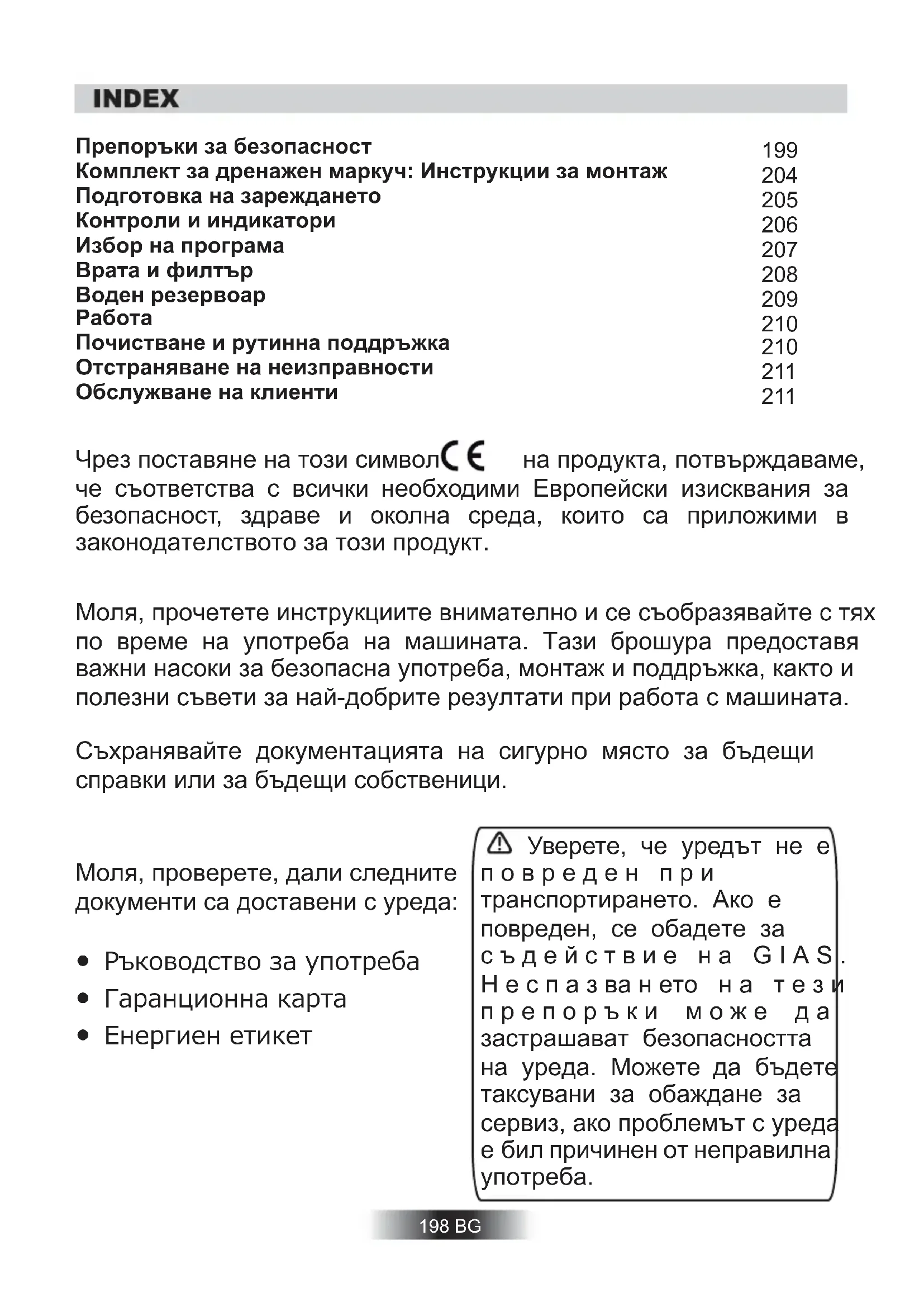 Препоръки за безопасност Комплект за дренажен маркуч: Инструкции за монтаж Подготовка на зареждането Контроли и индикатори Избор на програма Врата и филтър Воден резервоар