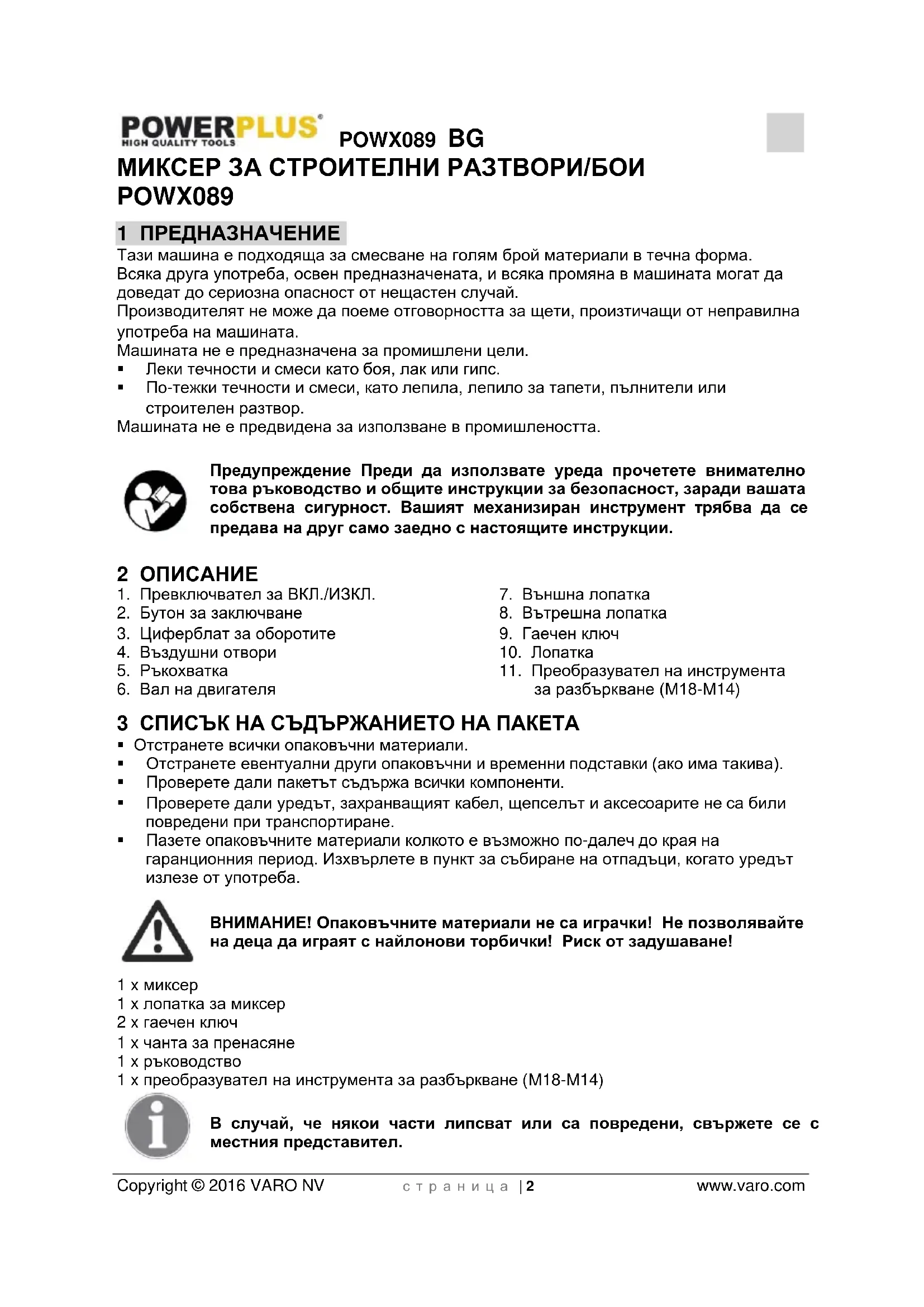 Съхранявайте фактурата за покупката като доказателство за датата, на която е направена тя. Трябва да върнете недемонтирания инструмент на продавача в приемливо чисто състояние, в оригиналното му лято куфарче, ако устройството има такова, придружавано от доказателството за покупката. 14 ОКОЛНА СРЕДА В случай, че вашият електрически уред се нуждае от смяна, не го изхвърляйте в домашната кофа за болклук, а го изхвърлете по екологически-безопасен начин. Отпадъчните електрически уреди не трябва да се изхвърлят заедно с домашния боклук. Моля рециклирайте в предназначените за целта места. Обърнете се към местните власти или към продавача за съвет относно рециклирането.POWX089 BG Copyright © 2016 VARO NV с т р а н и ц а | 10 www.varo.com 15 ДЕКЛАРАЦИЯ ЗА СЪОТВЕТСТВИЕ С VARO N.V. – Joseph Van Instraat 9 – BE2500 Lier – Белгия декларират, че Тип машина: Миксер За Строителни Разтвори/Бои Марка:POWERplus Номер на артикула: POWX089 е в съответствие с основните изисквания и други съответни разпоредби на приложимите Европейски директиви, базирани върху прилагането на Европейските хармонизирани стандарти. Всяка неупълномощена модификация на апарата анулира тази декларация. Европейски директиви (включително техните промени към датата на подписване, ако са приложими); 2014/30/EU 2006/42/EC 2011/65/EU Европейски хармонизирани стандарти (включително техните промени към датата на подписване, ако са приложими); EN60745-1 : 2009 EN55014-1 : 2006 EN55014-2 : 1997 EN61000-3-2 : 2014 EN61000-3-3 : 2013 Съхранител на техническата документация: Филип Ванкеркхов, VARO – Vic. Van Rompuy N.V. Долуподписаният действа от името на Изпълнителния директор на компанията, Hugo Cuypers Регулационни въпроси – мениджър по съответствията Date: 01/12/2016VARO - VIC. VAN ROMPUY nv