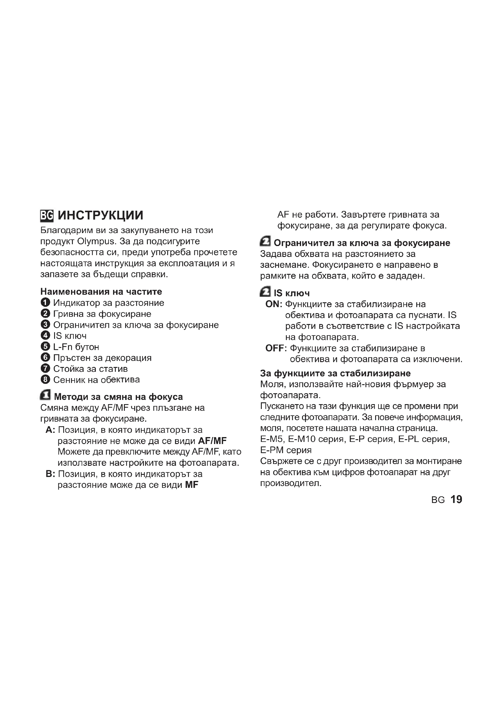 Благодарим ви за закупуването на този продукт Olympus. За да подсигурите безопасността си, преди употреба прочетете настоящата инструкция за експлоатация и я запазете за бъдещи справки. Наименования на частите 1 Индикатор за разстояние 2 Гривна за фокусиране 3 Ограничител за ключа за фокусиране 4 IS ключ 5 L-Fn бутон 6 Пръстен за декорация 7 Стойка за статив 8 Сенник на об