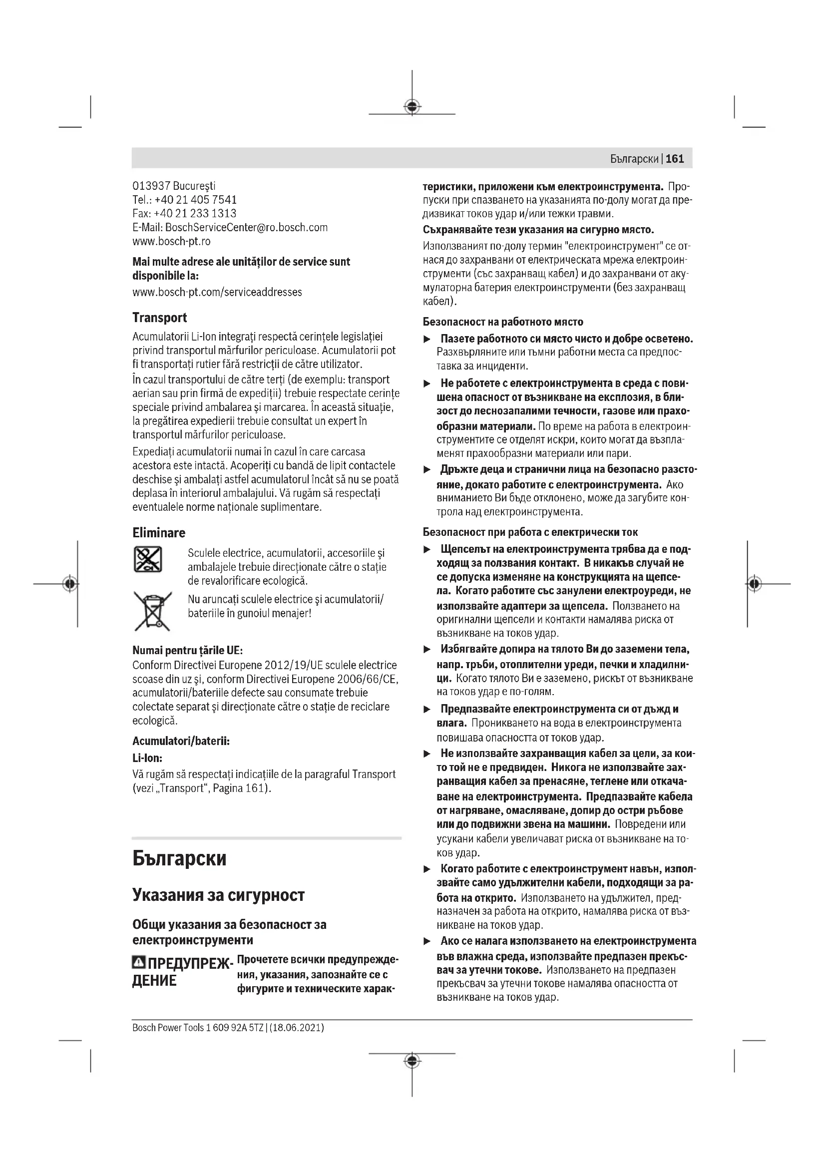 Robert Bosch SRL Service scule electrice Strada Horia Măcelariu Nr. 30–34, sector 1 013937 Bucureşti, România Тел.: +359(0)700 13 667 (Български) Факс: +40 212 331 313 Email: BoschServiceCenterBG@ro.bosch.com www.bosch-pt.com/bg/bg/ Други сервизни адреси ще откриете на: www.bosch-pt.com/serviceaddresses Транспортиране Включените в окомплектовката литиево-йонни акумулу- тарони батерии са в обхвата на изискванията на норма- тивните документи, касаещи продукти с повишена опас- ност. Акумулаторните батерии могат да бъдат транспорти- рани от потребителя на публични места без допълнителни разрешителни. 1 609 92A 5TZ | (18.06.2021) Bosch Power ToolsМакедонски | 169 При транспортиране от трети страни (напр. при въздушен транспорт или ползване на куриерски услуги) има специ- ални изисквания към опаковането и обозначаването им. За целта при подготовката на пакетирането се консулти- райте с експерт в съответната област. Изпращайте акумулаторни батерии само ако корпусът им не е повреден. Изолирайте открити контактни клеми с ле- пящи ленти и опаковайте акумулаторните батерии така, че да не могат да се изместват в опаковката си. Моля, спазвайте също и допълнителни национални предписа-