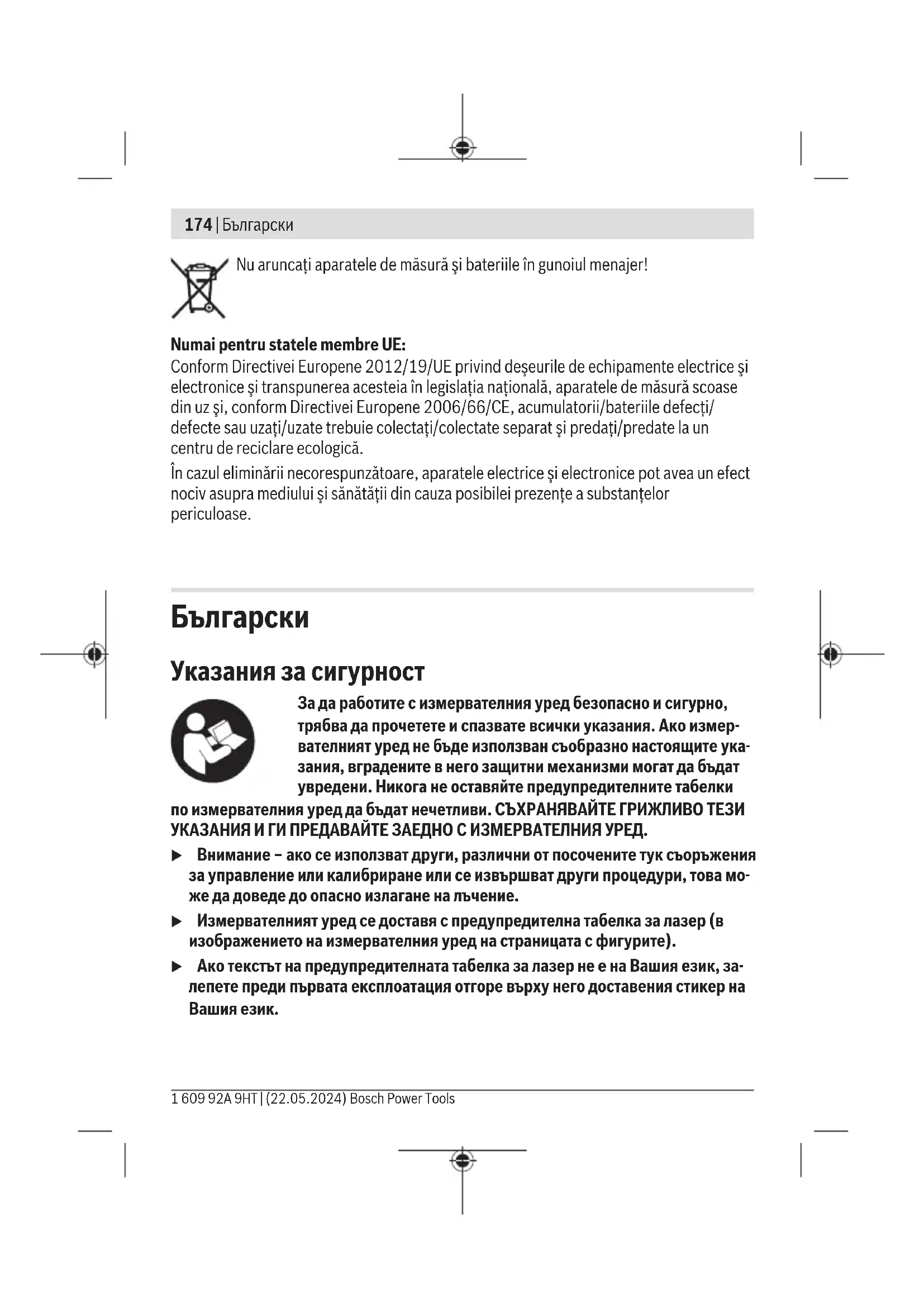 С оглед опазване на околната среда измервателния уред, обикновените или акуму- латорни батерии, допълнителните принадлежности и опаковките трябва да се пре- дават за оползотворяване на съдържащите се в тях суровини. Bosch Power Tools 1 609 92A 9HT | (22.05.2024)182 | Македонски Не изхвърляйте измервателните уреди и акумулаторните батерии/батери- ите при битовите отпадъци! Само за страни от ЕС: Съгласно европейска директива 2012/19/EС за старите електрически и електронни уреди и нейното транспортиране в националното право измервателните уреди, кои- то не могат да се ползват повече, а съгласно европейска директива 2006/66/EО повредени или изхабени обикновени или акумулаторни батерии, трябва да се съби- рат и предават за оползотворяване на съдържащите се в тях суровини. При неправилно изхвърляне старите електрически и електронни уреди поради въз- можното наличие на опасни вещества могат да окажат вредни влияния върху окол- ната среда и човешкото здраве.