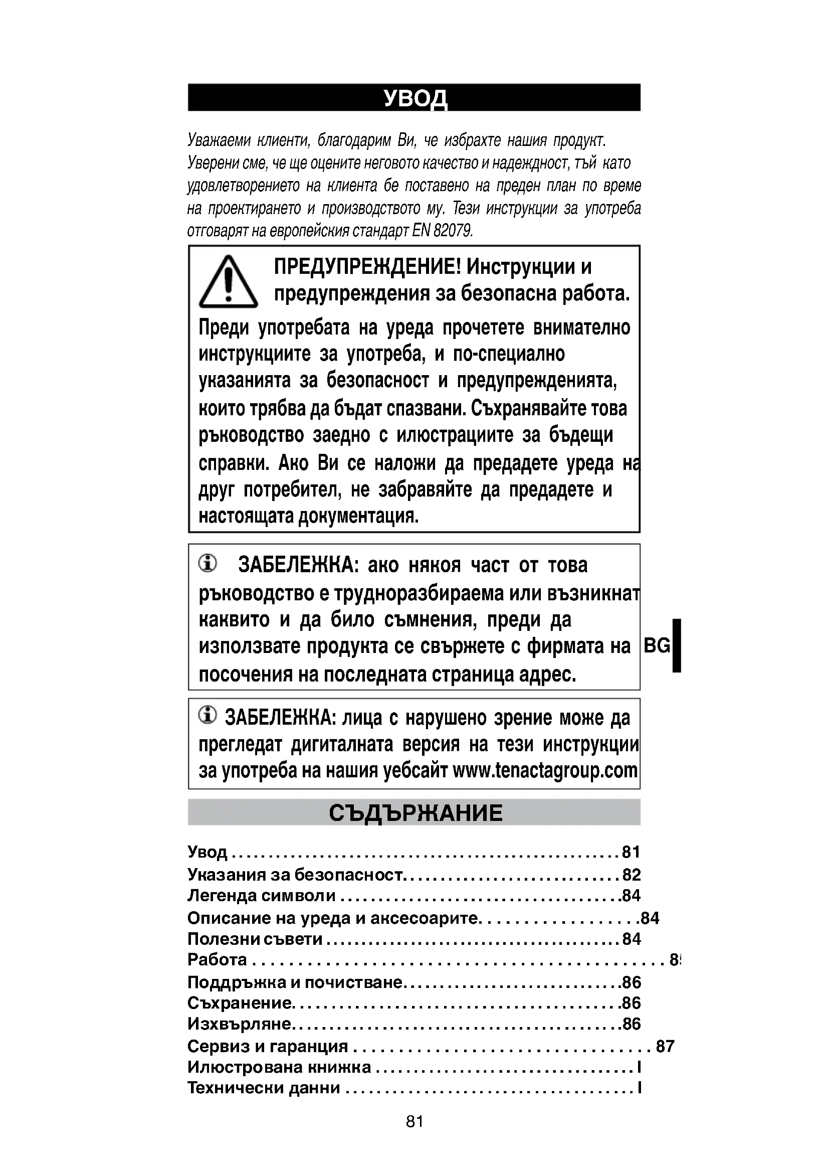 Уважаеми клиенти, благодарим Ви, че избрахте нашия продукт. Уверени сме, че ще оцените неговото качество и надеждност, тъй като удовлетворението на клиента бе поставено на преден план по време на проектирането и производството му. Тези инструкции за употреба отговарят на европейския стандарт EN 82079. ПРЕДУПРЕЖДЕНИЕ! Инструкции и предупреждения за безопасна работа. Преди употребата на уреда прочетете внимателно инструкциите за употреба, и по-специално указанията за безопасност и предупрежденията, които трябва да бъдат спазвани. Съхранявайте това ръководство заедно с илюстрациите за бъдещи справки. Ако Ви се наложи да предадете уреда на друг потребител, не забравяйте да предадете и настоящата документация. ЗАБЕЛЕЖКА: ако някоя част от това ръководство е трудноразбираема или възникнат каквито и да било съмнения, преди да използвате продукта се свържете с фирмата на посочения на последната страница адрес. ЗАБЕЛЕЖКА: лица с нарушено зрение може да прегледат дигиталната версия на тези инструкции за употреба на нашия уебсайт www.tenactagroup.com
