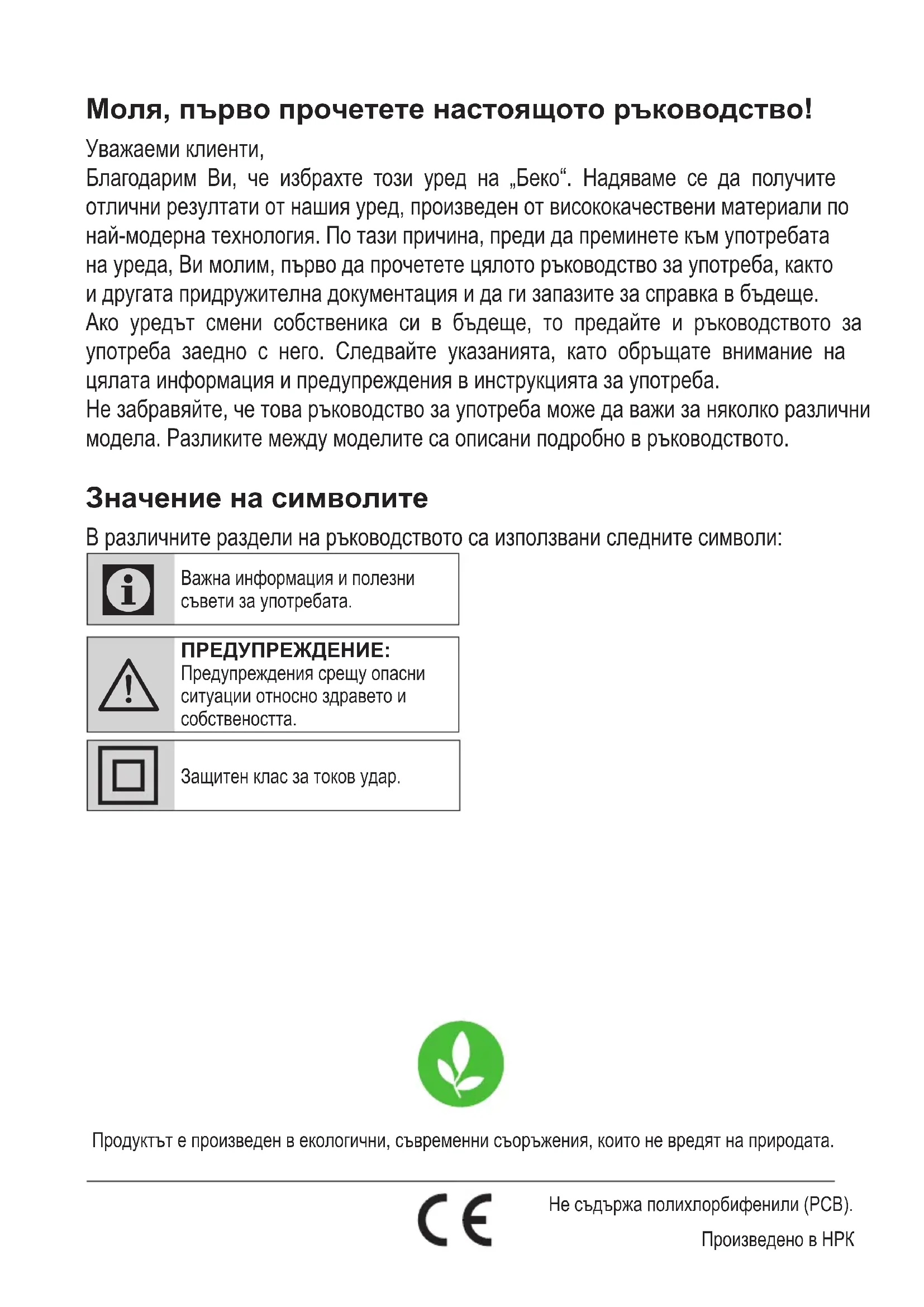 Użytkownikowi dodatkowo i nie wyłącza, nie ogranicza ani nie zawiesza uprawnień Użytkownika wynikających z przepisów o rękojmi za wady rzeczy sprzedanej na podstawie Kodeksu cywilnego.Моля, първо прочетете настоящото ръководство! Уважаеми клиенти, Благодарим Ви, че избрахте този уред на „Беко“. Надяваме се да получите отлични резултати от нашия уред, произведен от висококачествени материали по най-модерна технология. По тази причина, преди да преминете към употребата на уреда, Ви молим, първо да прочетете цялото ръководство за употреба, както и другата придружителна документация и да ги запазите за справка в бъдеще. Ако уредът смени собственика си в бъдеще, то предайте и ръководството за употреба заедно с него. Следвайте указанията, като обръщате внимание на цялата информация и предупреждения в инструкцията за употреба. Не забравяйте, че това ръководство за употреба може да важи за няколко различни модела. Разликите между моделите са описани подробно в ръководството. Значение на символите В различните раздели на ръководството са използвани следните символи: