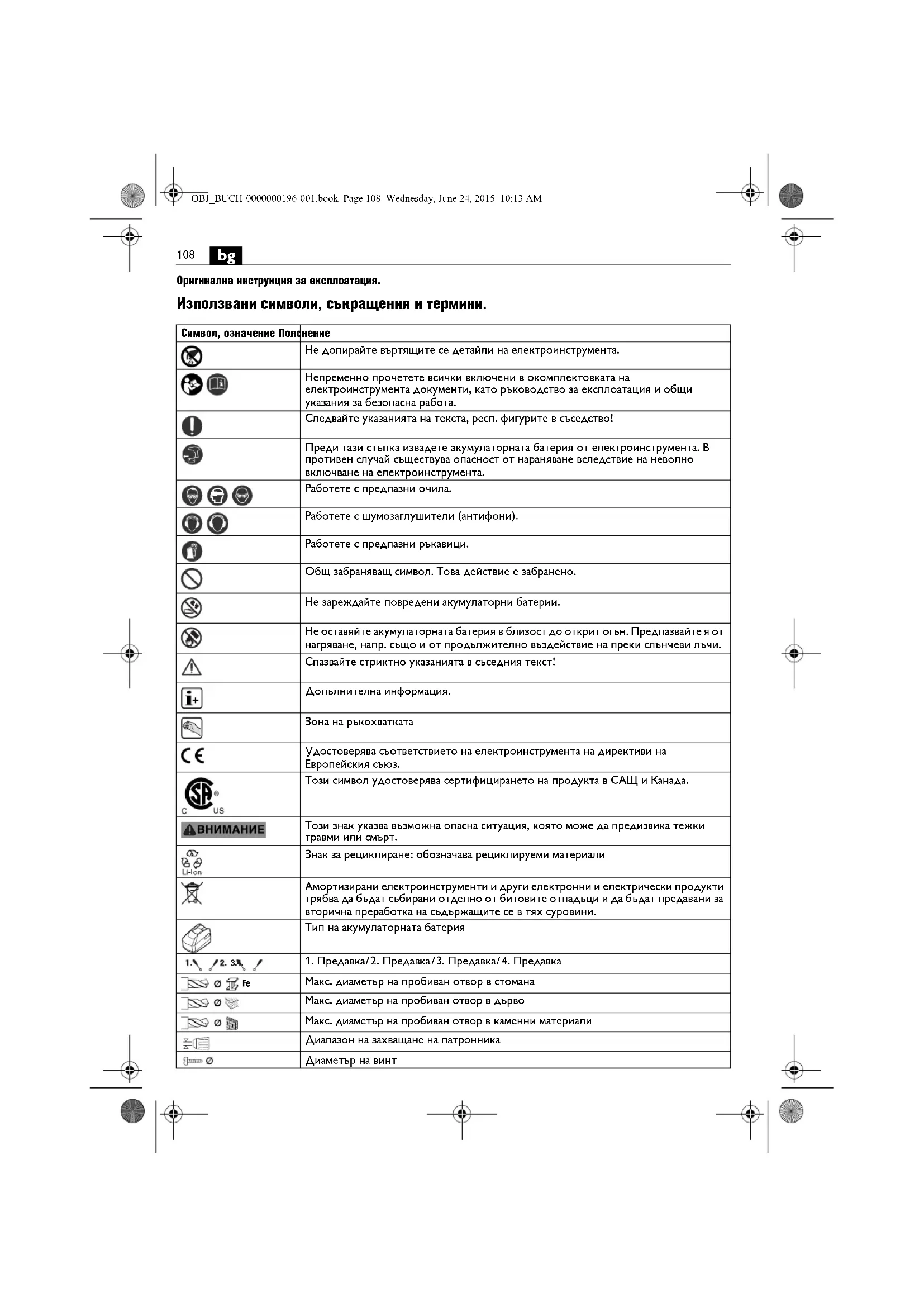 Оригинална инструкция за експлоатация. Използвани символи, съкращения и термини. Символ, означение Пояснение Не допирайте въртящите се детайли на електроинструмента. Непременно прочетете всички включени в окомплектовката на електроинструмента документи, като ръководство за експлоатация и общи указания за безопасна работа. Следвайте указанията на текста, респ. фигурите в съседство! Преди тази стъпка извадете акумулаторната батерия от електроинструмента. В противен случай съществува опасност от нараняване вследствие на неволно включване на електроинструмента. Работете с предпазни очила. Работете с шумозаглушители (антифони). Работете с предпазни ръкавици. Общ забраняващ символ. Това действие е забранено. Не зареждайте повредени акумулаторни батерии. Не оставяйте акумулаторната батерия в близост до открит огън. Предпазвайте я от нагряване, напр. също и от продължително въздействие на преки слънчеви лъчи. Спазвайте стриктно указанията в съседния текст! Допълнителна информация. Зона на ръкохватката Удостоверява съответствието на електроинструмента на директиви на Европейския съюз. Този символ удостоверява сертифицирането на продукта в САЩ и Канада. Този знак указва възможна опасна ситуация, която може да предизвика тежки травми или смърт. Знак за рециклиране: обозначава рециклируеми материали Амортизирани електроинструменти и други електронни и електрически продукти трябва да бъдат събирани отделно от битовите отпадъци и да бъдат предавани за вторична преработка на съдържащите се в тях суровини. Тип на акумулаторната батерия
