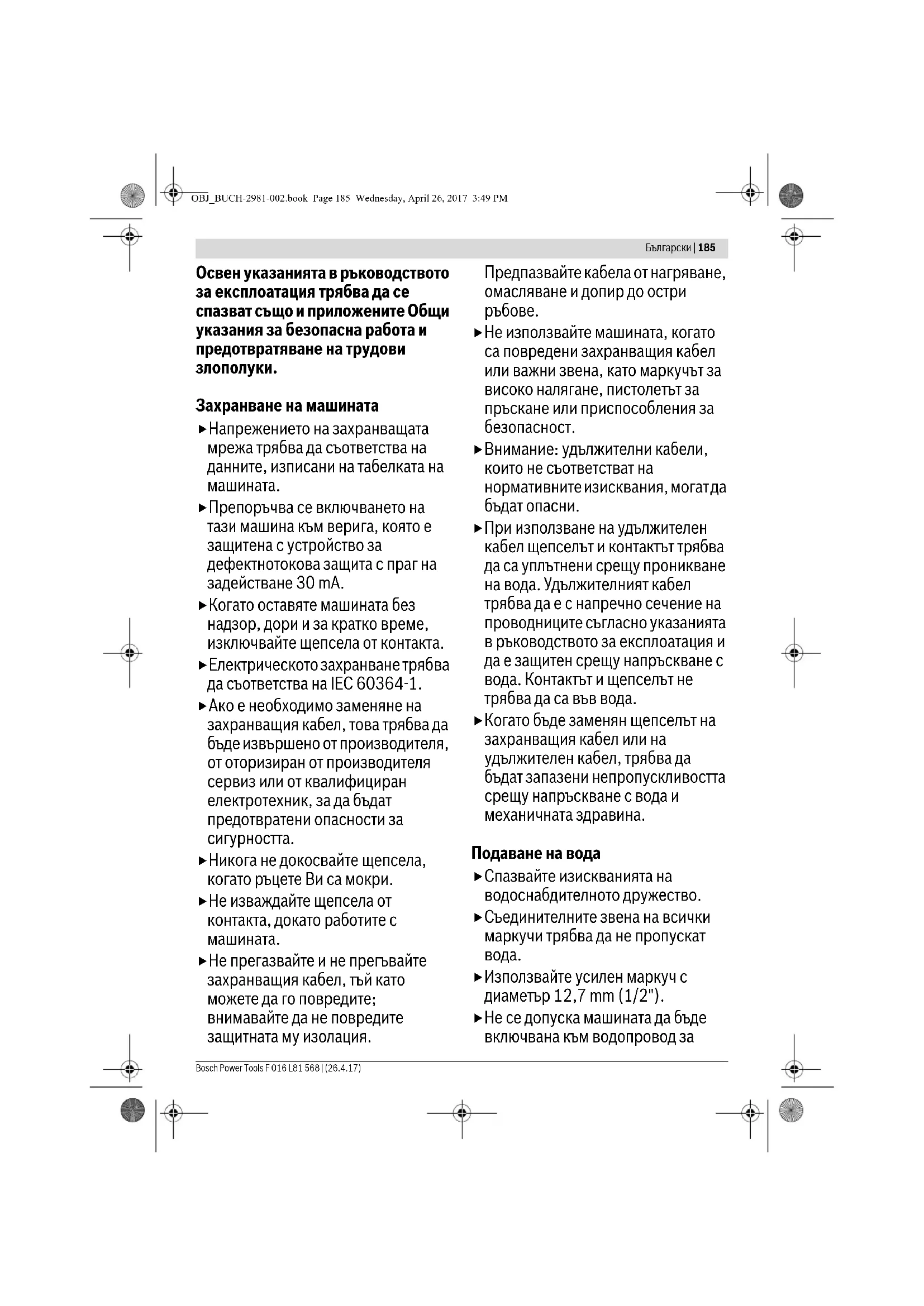 Използвайте усилен маркуч с диаметър 12,7 mm (1/2"). Не се допуска машината да бъде включвана към водопровод за OBJ_BUCH-2981-002.book Page 185 Wednesday, April 26, 2017 3:49 PM186 | Български F 016 L81 568 | (26.4.17) Bosch Power Tools питейна вода без възвратен вентил. Водата, която може да протече в обратна посока, се счита за негодна