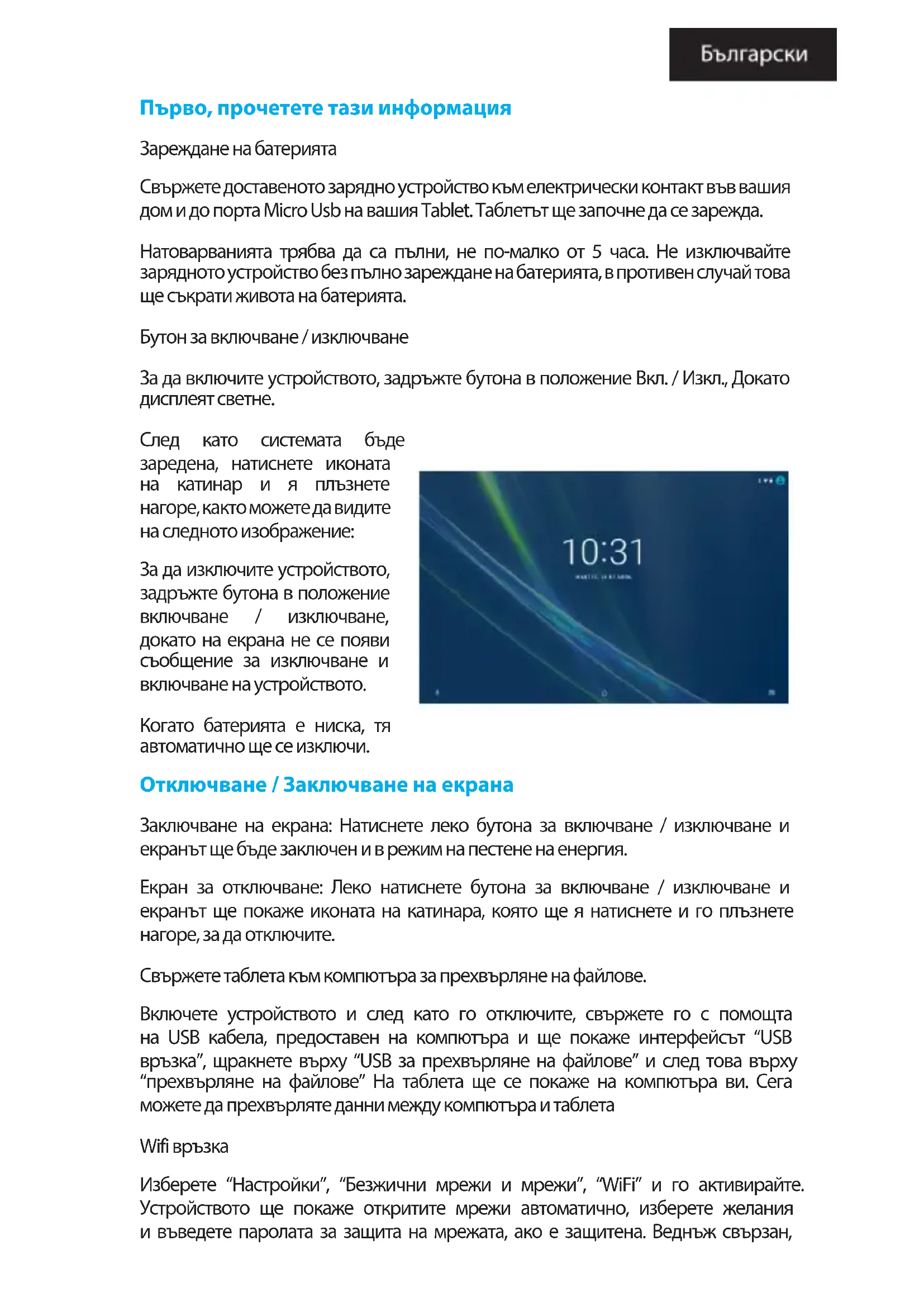 Зареждане на батерията Свържете доставеното зарядно устройство към електрически контакт във вашия дом и до порта Micro Usb на вашия Tablet. Таблетът ще започне да се зарежда. Натоварванията трябва да са пълни, не по-малко от 5 часа. Не изключвайте зарядното устройство без пълно зареждане на батерията, в противен случай това ще съкрати живота на батерията. Бутон за включване / изключване За да включите устройството, задръжте бутона в положение Вкл. / Изкл., Докато дисплеят светне. След като системата бъде заредена, натиснете иконата на катинар и я плъзнете нагоре, както можете да видите на следното изображение: За да изключите устройството, задръжте бутона в положение включване / изключване, докато на екрана не се появи съобщение за изключване и включване на устройството. Когато батерията е ниска, тя автоматично ще се изключи. Отключване / Заключване на екрана Заключване на екрана: Натиснете леко бутона за включване / изключване и екранът ще бъде заключен и в режим на пестене на енергия. Екран за отключване: Леко натиснете бутона за включване / изключване и екранът ще покаже иконата на катинара, която ще я натиснете и го плъзнете нагоре, за да отключите. Свържете таблета към компютъра за прехвърляне на файлове. Включете устройството и след като го отключите, свържете го с помощта на USB кабела, предоставен на компютъра и ще покаже интерфейсът “USB връзка”, щракнете върху “USB за прехвърляне на файлове” и след това върху “прехвърляне на файлове” На таблета ще се покаже на компютъра ви. Сега можете да прехвърляте данни между компютъра и таблета Wifi връзка Изберете “Настройки”, “Безжични мрежи и мрежи”, “WiFi” и го активирайте. Устройството ще покаже откритите мрежи автоматично, изберете желания и въведете паролата за защита на мрежата, ако е защитена. Веднъж свързан,иконата на Wifi мрежата ще се появи като свързана на главния екран. Bluetooth връзка Изберете “Настройки”, “Bluetooth” и го активирайте. Кликнете върху Търсене на устройства, тя ще ви покаже близките Bluetooth устройства, ще го изберете и ще се свърже автоматично. SIM и Micro SD карта Изключете таблета, свалете горния капак и поставете SIM картата в слота SIM1 или SIM2 и го включете. (Ако имате друга SIM карта, поставете я в слота SIM2). Трябва да въведете ПИН кода, за да заключите таблета. Ако въведете ПИН-кода неправилно три пъти подред, SIM картата ще бъде заключена. В този случай трябва да въведете PUK кода, за да отключите SIM