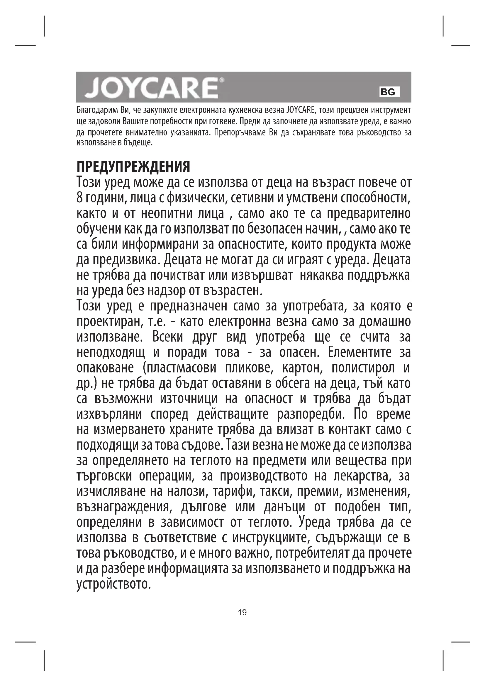 Благодарим Ви, че закупихте електронната кухненска везна JOYCARE, този прецизен инструмент ще задоволи Вашите потребности при готвене. Преди да започнете да използвате уреда, е важно да прочетете внимателно указанията. Препоръчваме Ви да съхранявате това ръководство за използване в бъдеще. ПРЕДУПРЕЖДЕНИЯ Този уред може да се използва от деца на възраст повече от 8 години, лица с физически, сетивни и умствени способности, както и от неопитни лица , само ако те са предварително обучени как да го използват по безопасен начин, , само ако те са били информирани за опасностите, които продукта може да предизвика. Децата не могат да си играят с уреда. Децата не трябва да почистват или извършват някаква поддръжка на уреда без надзор от възрастен. Този уред е предназначен само за употребата, за която е проектиран, т.е. - като електронна везна само за домашно използване. Всеки друг вид употреба ще се счита за неподходящ и поради това - за опасен. Елементите за опаковане (пластмасови пликове, картон, полистирол и др.) не трябва да бъдат оставяни в обсега на деца, тъй като са възможни източници на опасност и трябва да бъдат изхвърляни според действащите разпоредби. По време на измерването храните трябва да влизат в контакт само с подходящи за това съдове. Тази везна не може да се използва за определянето на теглото на предмети или вещества при търговски операции, за производството на лекарства, за изчисляване на налози, тарифи, такси, премии, изменения, възнаграждения, дългове или данъци от подобен тип, определяни в зависимост от теглото. Уреда трябва да се използва в съответствие с инструкциите, съдържащи се в това ръководство, и е много важно, потребителят да прочете и да разбере информацията за използването и поддръжка на устройството.20 Уреда да се пази от прах и влага; не го излагайте на слънце или на прекомерно високи температури. ТЕХНИЧЕСКИ ХАРАКТЕРИСТИКИ Капацитет: 5 kg Разделение: 1 g Сензорен екран (Touchscreen) Ултра тънка, само 18 мм LCD дисплей Чиния от закалено стъкло Копче за избор на единица-мярка g/oz (г/унция) Копче TARE/ON/OFF: копче за включване, изключване и тара тегло Автоматично изключване Индикатор за превишаване на теглото Индикатор за изтощени батерии Захранване: 2 литиеви батерии CR2032 (3V) включени батерии (пробни) Условия за употреба: Стайната температура: от -10 ° C до 40 ° C.Относителна влажност: от 30% до 75% без кондензация. Налягане: от 700 - 1060 HPA. Условия на околната среда за транспорт и съхранение: Температура: от 10 до 40 ° С. Влажност на въздуха: от 5% до 95%.Налягане: от 700 - 1060 HPA. УКАЗАНИЯ ЗА ИЗПОЛЗВАНЕ Поставете батерията в съответното отделение, като обърнете внимание на правилните полюси посочени на батерията. Сменете батерията, когато тя е изчерпана. Процедура на измерване Поставете везната върху равна и стабилна повърхност. Поставете купата или който и да е друг съд върху чинията на везната, преди да я включите. Докоснете леко копчето TARE/ON/OFF, за да включите уреда. Дисплеят ще покаже “0g” или “000 oz”; тогава везната е готова за измерване. Изберете единицата-мярка g/oz с помощта на копчето “UNIT”, намиращо се под везната. Поставяйте винаги хранителния продукт за измерване или купата в средата на везната и дисплеят ще покаже отчетеното тегло. ВНИМАНИЕ: ВИНАГИ ИЗЧАКВАЙТЕ ДИСПЛЕЯТ ДА ПОКАЖЕ “0”, ПРЕДИ ДА ПРИСТЪПИТЕ КЪМ