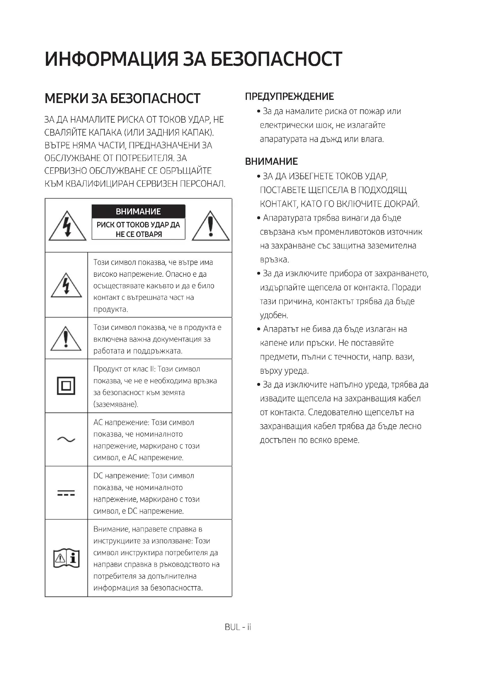 РИСК ОТ ТОКОВ УДАР ДА НЕ СЕ ОТВАРЯТози символ показва, че вътре има високо напрежение. Опасно е да осъществявате какъвто и да е било контакт с вътрешната част на продукта.Този символ показва, че в продукта е включена важна документация за работата и поддръжката.Продукт от клас II: Този символ показва, че не е необходима връзка за безопасност към земята (заземяване).AC напрежение: Този символ показва, че номиналното напрежение, маркирано с този символ, е AC напрежение.DC напрежение: Този символ показва, че номиналното напрежение, маркирано с този символ, е DC напрежение.Внимание, направете справка в инструкциите за използване: Този символ инструктира потребителя да направи справка в ръководството на потребителя за допълнителна информация за безопасността. ПРЕДУПРЕЖДЕНИЕ