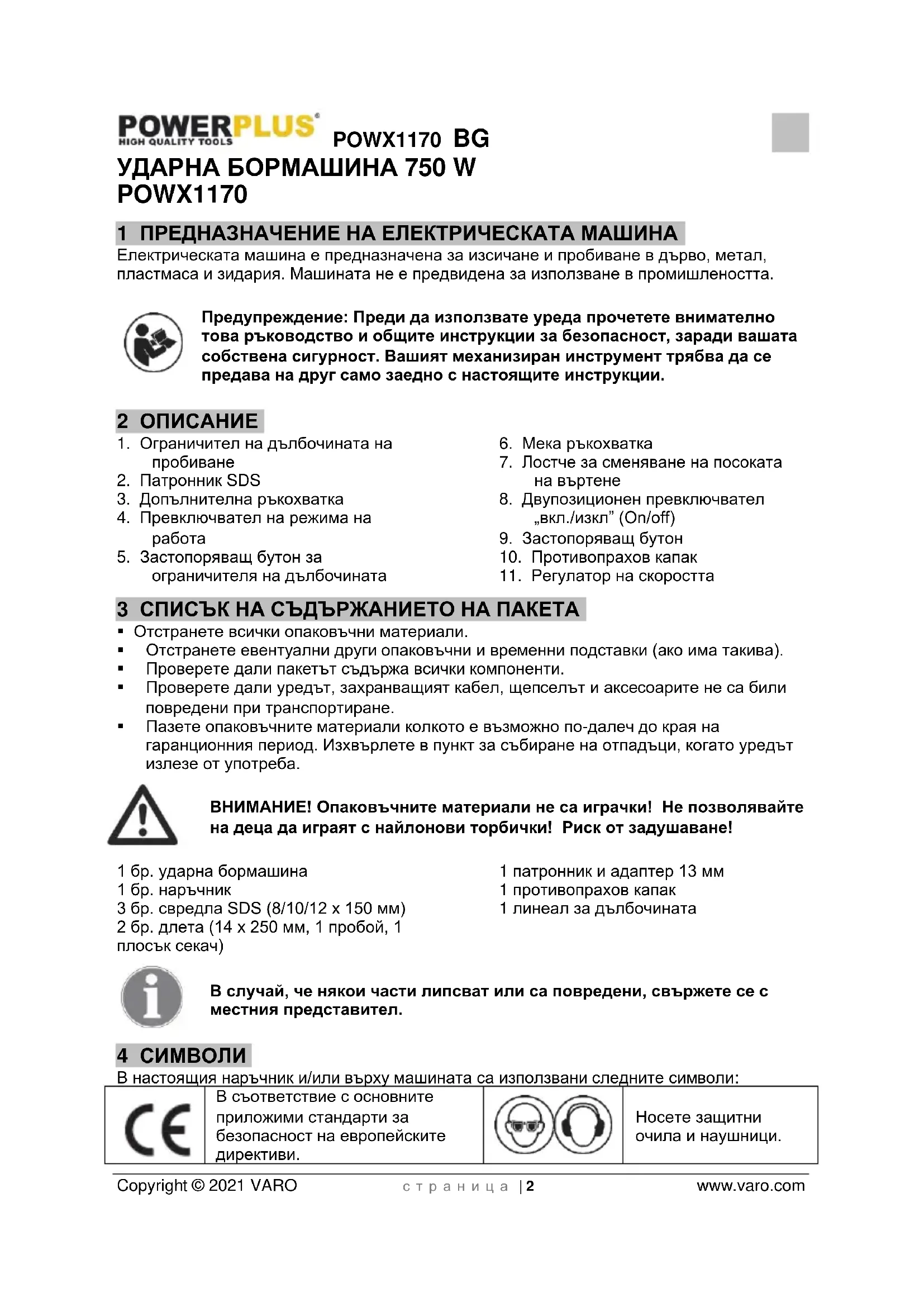- 14 ДЕКЛАРАЦИЯ ЗА СЪОТВЕТСТВИЕ POWX1170 BG Copyright © 2021 VARO с т р а н и ц а | 2 www.varo.com УДАРНА БОРМАШИНА 750 W POWX1170 1 ПРЕДНАЗНАЧЕНИЕ НА ЕЛЕКТРИЧЕСКАТА МАШИНА Електрическата машина е предназначена за изсичане и пробиване в дърво, метал, пластмаса и зидария. Машината не е предвидена за използване в промишлеността. Предупреждение: Преди да използвате уреда прочетете внимателно това ръководство и общите инструкции за безопасност, заради вашата собствена сигурност. Вашият механизиран инструмент трябва да се предава на друг само заедно с настоящите инструкции. 2 ОПИСАНИЕ p. 10
