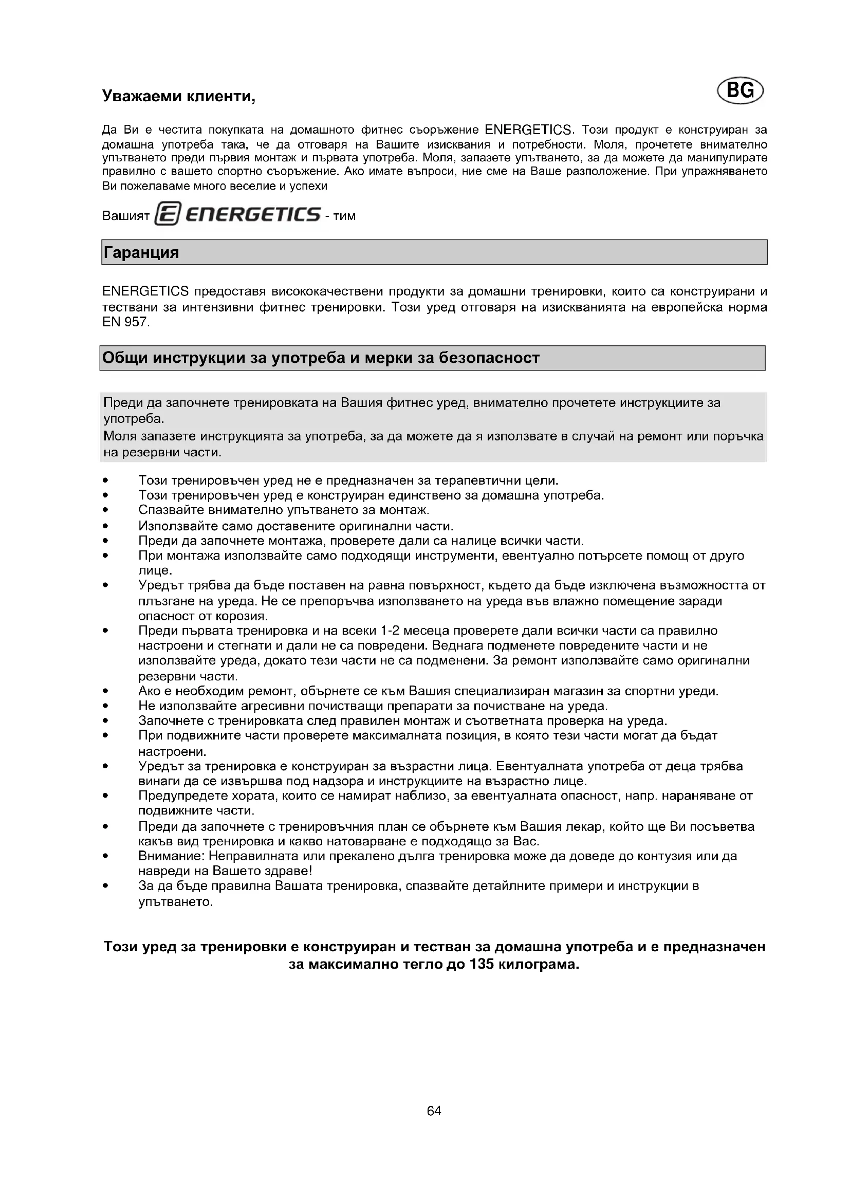 Уважаеми клиенти, Да Ви е честита покупката на домашното фитнес съоръжение ENERGETICS . Този продукт е конструиран за домашна употреба така, че да отговаря на Вашите изисквания и потребности. Моля, прочетете внимателно упътването преди първия монтаж и първата употреба. Моля, запазете упътването, за да можете да манипулирате правилно с вашето спортно съоръжение. Ако имате въпроси, ние сме на Ваше разположение. При упражняването Ви пожелаваме много веселие и успехи