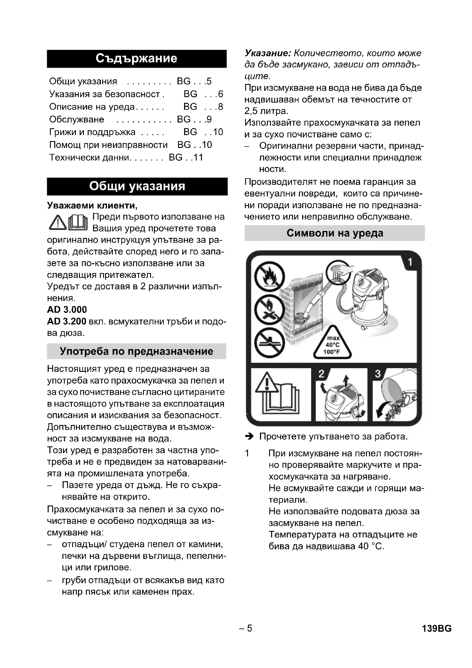 При изсмукване на вода не бива да бъде надвишаван обемът на течностите от 2,5 литра. Използвайте прахосмукачката за пепел и за сухо почистване само с: – Оригинални резервни части, принад- лежности или специални принадлеж