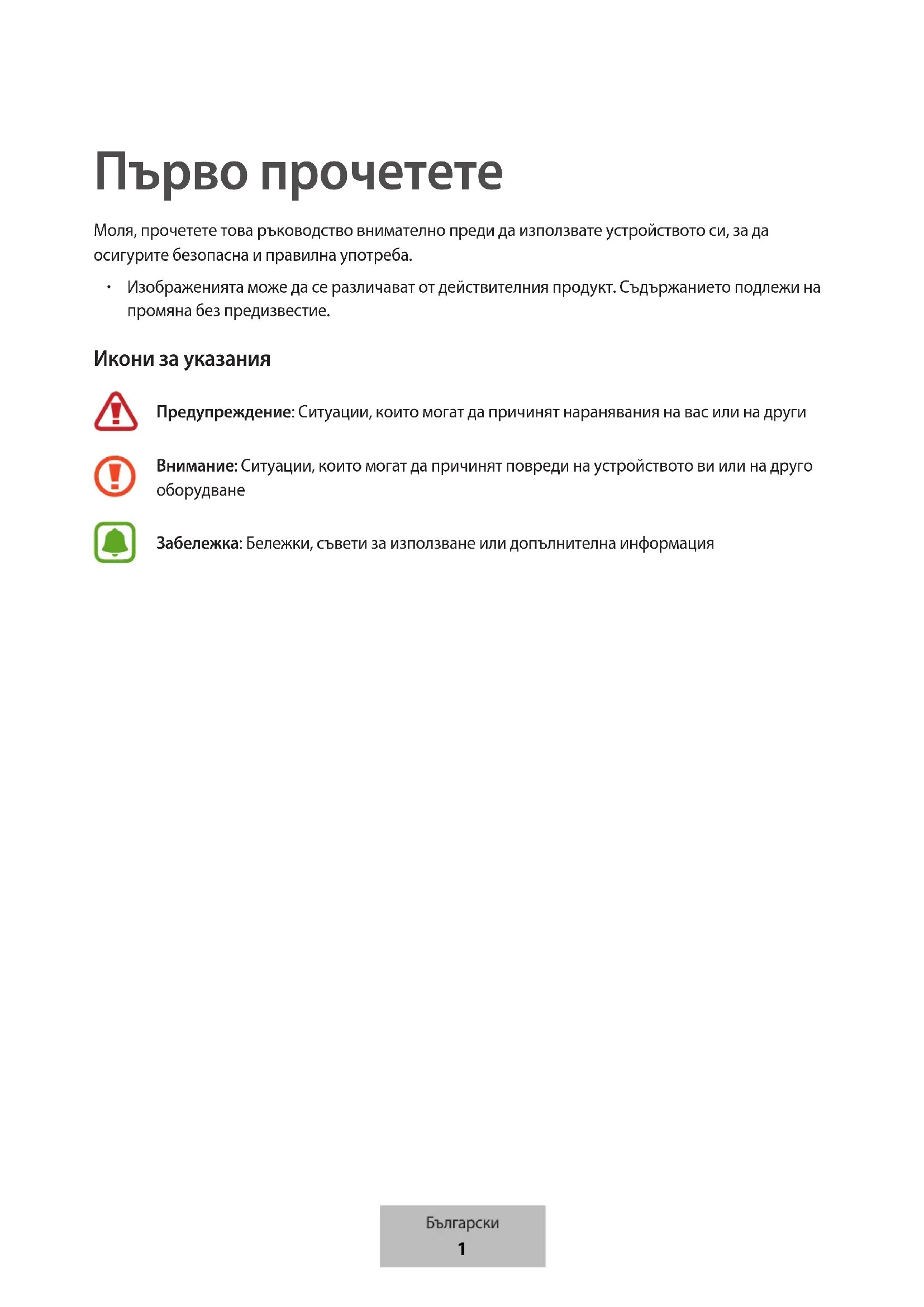 Изображенията може да се различават от действителния продукт. Съдържанието подлежи на промяна без предизвестие. Икони за указания Предупреждение: Ситуации, които могат да причинят наранявания на вас или на други Внимание: Ситуации, които могат да причинят повреди на устройството ви или на друго