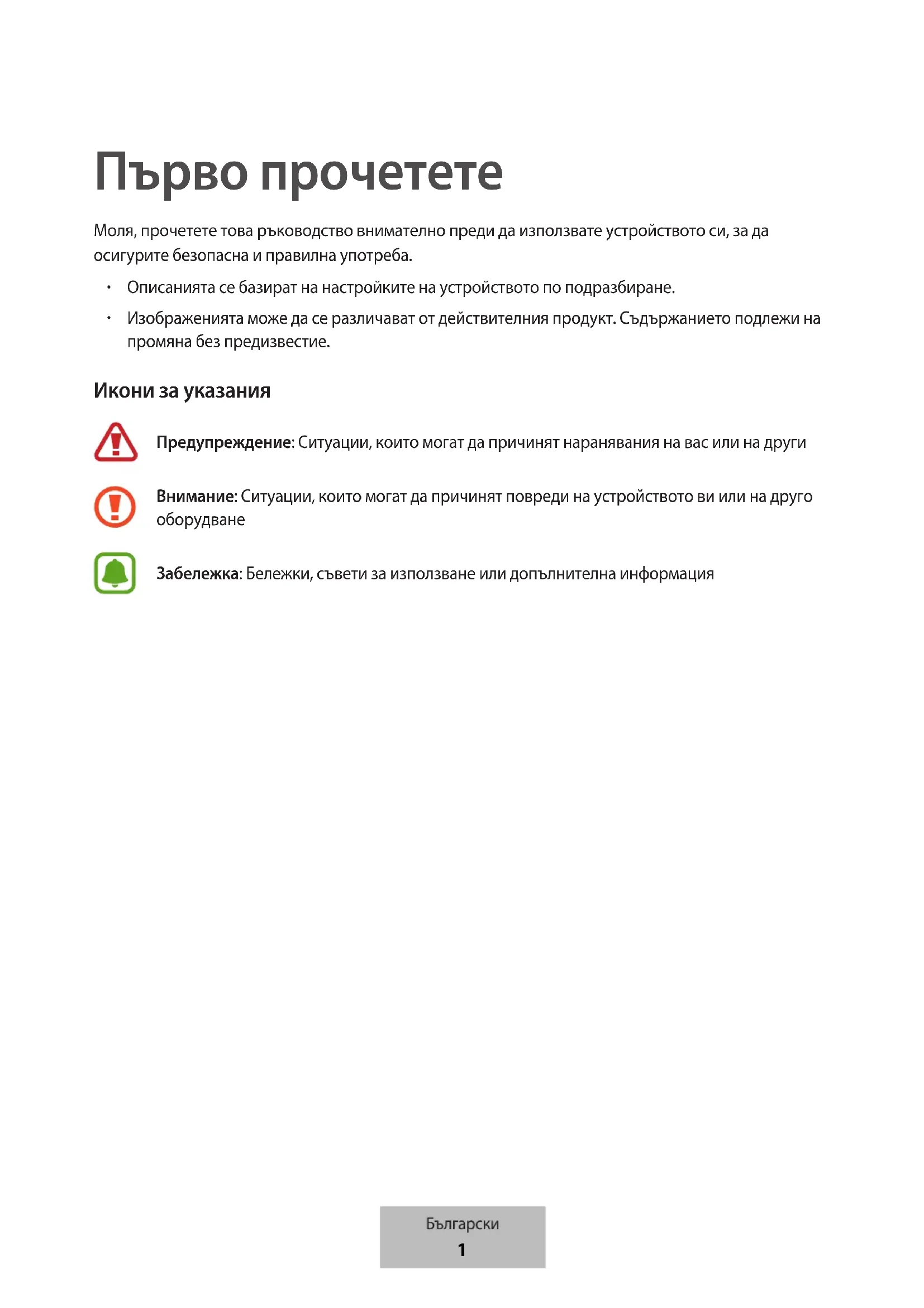 Изображенията може да се различават от действителния продукт. Съдържанието подлежи на промяна без предизвестие. Икони за указания Предупреждение: Ситуации, които могат да причинят наранявания на вас или на други Внимание: Ситуации, които могат да причинят повреди на устройството ви или на друго