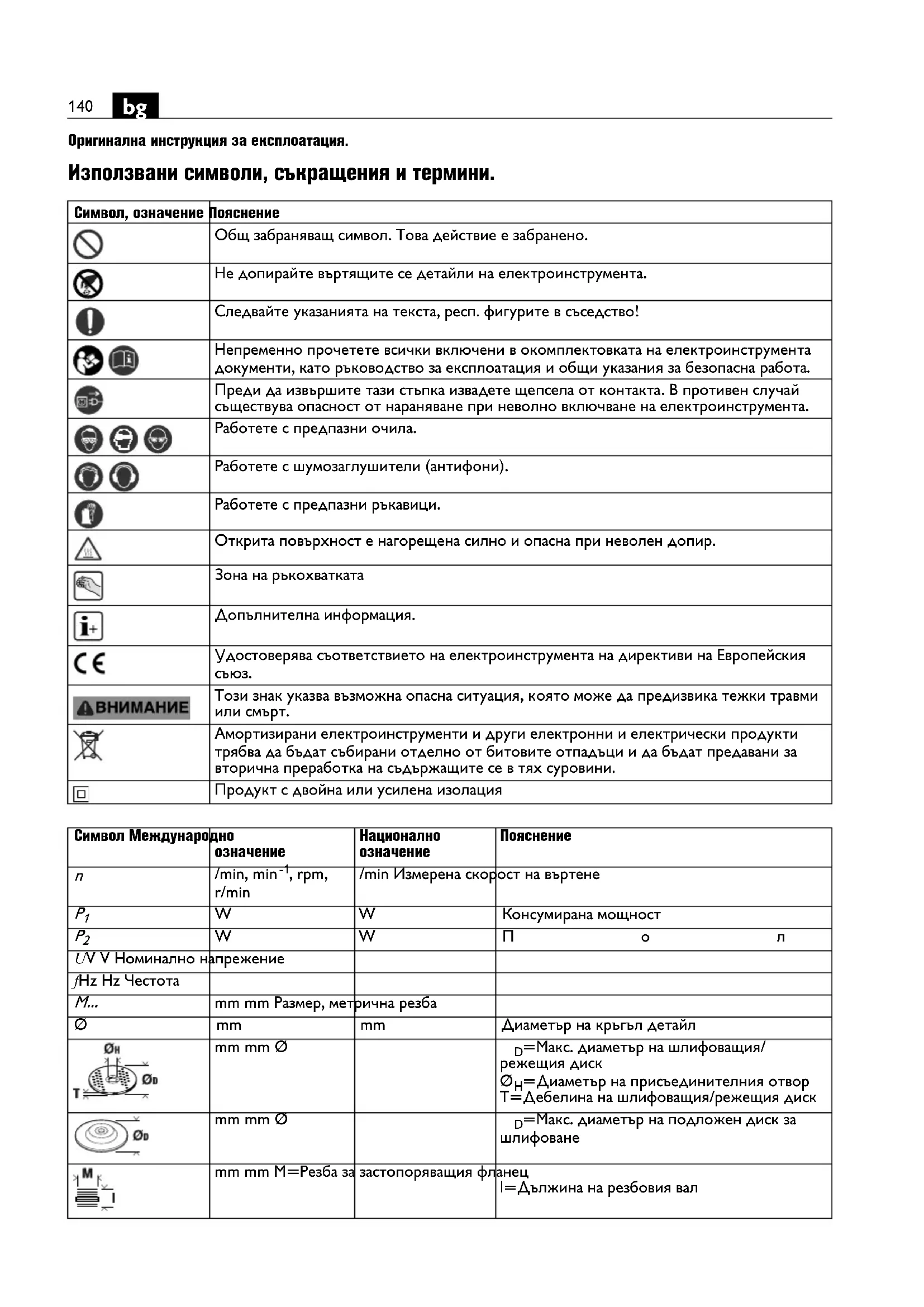 Оригинална инструкция за експлоатация. Използвани символи, съкращения и термини. Символ, означение Пояснение Общ забраняващ символ. Това действие е забранено. Не допирайте въртящите се детайли на електроинструмента. Следвайте указанията на текста, респ. фигурите в съседство! Непременно прочетете всички включени в окомплектовката на електроинструмента документи, като ръководство за експлоатация и общи указания за безопасна работа. Преди да извършите тази стъпка извадете щепсела от контакта. В противен случай съществува опасност от нараняване при неволно включване на електроинструмента. Работете с предпазни очила. Работете с шумозаглушители (антифони). Работете с предпазни ръкавици. Открита повърхност е нагорещена силно и опасна при неволен допир. Зона на ръкохватката Допълнителна информация. Удостоверява съответствието на електроинструмента на директиви на Европейския