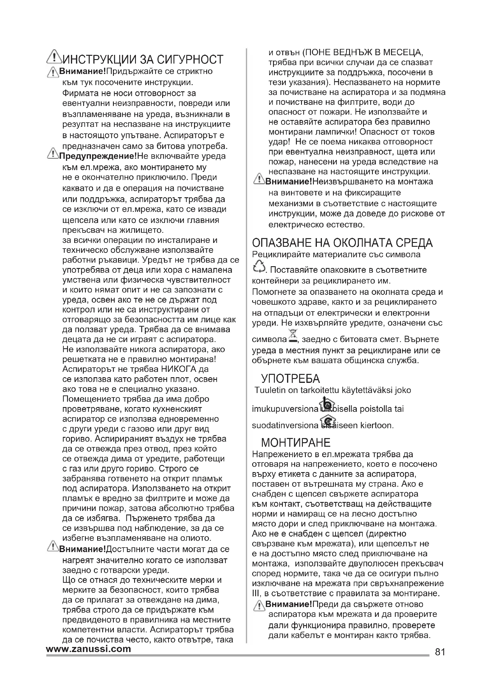 (4), maksimale (5). Përdorni shpejtësinë maksimale në rast përqëndrimi të veçantë të avujve të gatimit. Ju këshillojmë ta ndizni thithësin 5 minuta para se të fi lloni të gatuani dhe ta lini të punojë për rreth 15 minuta pas përfundimit të gatimit. NDRIÇIMI Shkëputeni pajisjen nga rryma elektrike. Kujdes! Përpara se t’i prekni llambat sigurohuni që të jenë ftohur. Zevendesohet llampa e djegur me nje llampe tjeter te te njejtit tip , siç eshte speçifi kuar ne etikete o afer llampes se aspiratorit (E14).81 www.zanussi.com ИНСТРУКЦИИ ЗА СИГУРНОСТ Внимание! Придържайте се стриктно към тук посочените инструкции. Фирмата не носи отговорност за евентуални неизправности, повреди или възпламеняване на уреда, възникнали в резултат на неспазване на инструкциите в настоящото упътване. Аспираторът е предназначен само за битова употреба. Предупреждение! Не включвайте уреда към ел.мрежа, ако монтирането му не е окончателно приключило. Преди каквато и да е операция на почистване или поддръжка, аспираторът трябва да се изключи от ел.мрежа, като се извади щепсела или като се изключи главния прекъсвач на жилището. за всички операции по инсталиране и техническо обслужване използвайте работни ръкавици. Уредът не трябва да се употребява от деца или хора с намалена умствена или физическа чувствителност и които нямат опит и не са запознати с уреда, освен ако те не се държат под контрол или не са инструктирани от отговарящо за безопасността им лице как да ползват уреда. Трябва да се внимава децата да не си играят с аспиратора. Не използвайте никога аспиратора, ако решетката не е правилно монтирана! Аспираторът не трябва НИКОГА да се използва като работен плот, освен ако това не е специално указано. Помещението трябва да има добро проветряване, когато кухненският аспиратор се използва едновременно с други уреди с газово или друг вид гориво. Аспирираният въздух не трябва да се отвежда през отвод, през който се отвежда дима от уредите, работещи с газ или друго гориво. Строго се забранява готвенето на открит пламък под аспиратора. Използването на открит пламък е вредно за филтрите и може да причини пожар, затова абсолютно трябва да се избягва. Пърженето трябва да се извършва под наблюдение, за да се избегне възпламеняване на олиото. Внимание! Достъпните части могат да се нагреят значително когато се използват заедно с готварски уреди. Що се отнася до техническите мерки и мерките за безопасност, които трябва да се прилагат за отвеждане на дима, трябва строго да се придържате към предвиденото в правилника на местните компетентни власти. Аспираторът трябва