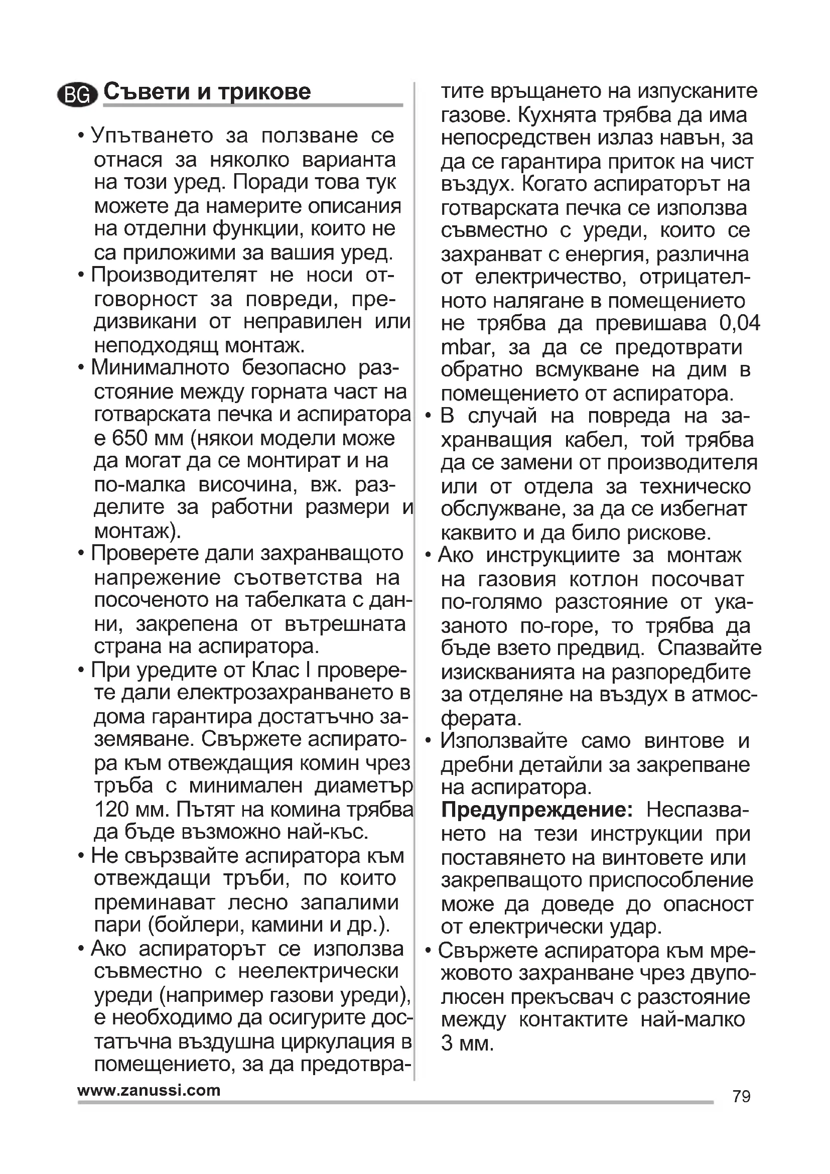 - Свържете аспиратора към мре- жовото захранване чрез двупо- люсен прекъсвач с разстояние между контактите най-малко 3 мм. BG80 www.zanussi.com