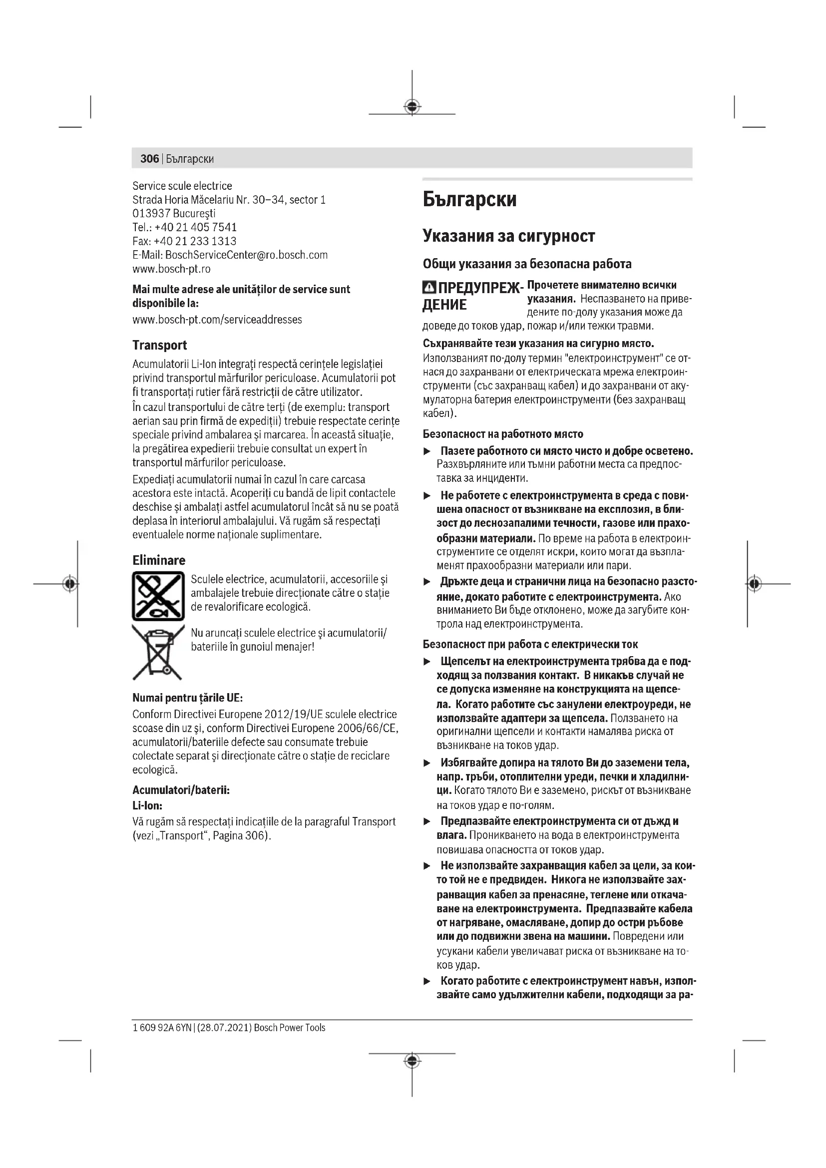Robert Bosch SRL Service scule electrice Strada Horia Măcelariu Nr. 30–34, sector 1 013937 Bucureşti, România Тел.: +359(0)700 13 667 (Български) Факс: +40 212 331 313 Email: BoschServiceCenterBG@ro.bosch.com www.bosch-pt.com/bg/bg/ Други сервизни адреси ще откриете на: www.bosch-pt.com/serviceaddresses Транспортиране Включените в окомплектовката литиево-йонни акумулу- тарони батерии са в обхвата на изискванията на норма- тивните документи, касаещи продукти с повишена опас- ност. Акумулаторните батерии могат да бъдат транспорти- рани от потребителя на публични места без допълнителни разрешителни. При транспортиране от трети страни (напр. при въздушен транспорт или ползване на куриерски услуги) има специ- ални изисквания към опаковането и обозначаването им. За целта при подготовката на пакетирането се консулти- райте с експерт в съответната област. Изпращайте акумулаторни батерии само ако корпусът им не е повреден. Изолирайте открити контактни клеми с ле- пящи ленти и опаковайте акумулаторните батерии така, че да не могат да се изместват в опаковката си. Моля, спазвайте също и допълнителни национални предписа-