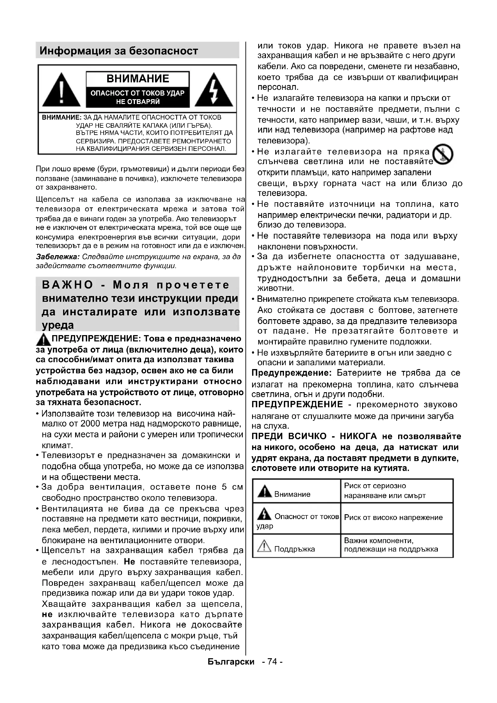 ВНИМАНИЕ: ЗА ДА НАМАЛИТЕ ОПАСНОСТТА ОТ ТОКОВ УДАР НЕ СВАЛЯЙТЕ КАПАКА (ИЛИ ГЪРБА). ВЪТРЕ НЯМА ЧАСТИ, КОИТО ПОТРЕБИТЕЛЯТ ДА СЕРВИЗИРА. ПРЕДОСТАВЕТЕ РЕМОНТИРАНЕТО НА КВАЛИФИЦИРАНИЯ СЕРВИЗЕН ПЕРСОНАЛ. Забележка: Следвайте инструкциите на екрана, за да задействате съответните функции. При лошо време (бури, гръмотевици) и дълги периоди без ползване (заминаване в почивка), изключете телевизора от захранването. Щепселът на кабела се използва за изключване на телевизора от електрическата мрежа и затова той трябва да е винаги годен за употреба. Ако телевизорът не е изключен от електрическата мрежа, той все още ще консумира електроенергия във всички ситуации, дори телевизорът да е в режим на готовност или да е изключен. ВАЖНО - Моля прочетете внимателно тези инструкции преди да инсталирате или използвате