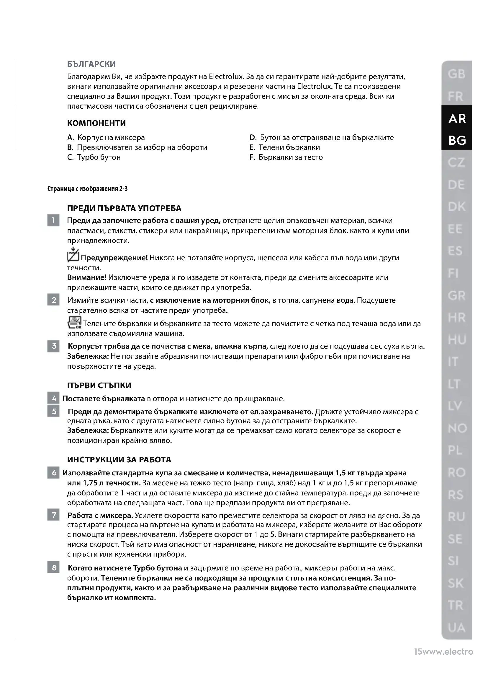 Внимание! Изключете уреда и го извадете от контакта, преди да смените аксесоарите или прилежащите части, които се движат при употреба. 2 Измийте всички части, с изключение на моторния блок, в топла, сапунена вода. Подсушете старателно всяка от частите преди употреба. Телените бъркалки и бъркалките за тесто можете да почистите с четка под течаща вода или да използвате съдомиялна машина. 3 Корпусът трябва да се почиства с мека, влажна кърпа, след което да се подсушава със суха кърпа. Забележка: Не ползвайте абразивни почистващи препарати или фибро гъби при почистване на повърхностите на уреда. ПЪРВИ СТЪПКИ 4 Поставете бъркалката в отвора и натиснете до прищракване. 5 Преди да демонтирате бъркалките изключете от ел.захранването. Дръжте устойчиво миксера с едната ръка, като с другата натиснете силно бутона за да отстраните бъркалките. Забележка: Бъркалките или куките могат да се премахват само когато селектора за скорост е позициониран крайно вляво. ИНСТРУКЦИИ ЗА РАБОТА 6 Използвайте стандартна купа за смесване и количества, ненадвишаващи 1,5 кг твърда храна или 1,75 л течности. За месене на тежко тесто (напр. пица, хляб) над 1 кг и до 1,5 кг препоръчваме да обработите 1 част и да оставите миксера да изстине до стайна температура, преди да започнете обработката на следващата част. Това ще предпази продукта ви от прегряване. 7 Работа с миксера. Усилете скоростта като преместите селектора за скорост от ляво на дясно. За да стартирате процеса на въртене на купата и работата на миксера, изберете желаните от Вас обороти с помощта на превключвателя. Изберете скорост от 1 до 5. Винаги стартирайте разбъркването на ниска скорост. Тъй като има опасност от нараняване, никога не докосвайте въртящите се бъркалки с пръсти или кухненски прибори. 8 Когато натиснете Турбо бутона и задържите по време на работа., миксерът работи на макс. обороти. Телените бъркалки не са подходящи за продукти с плътна консистенция. За по- плътни продукти, какт о и за разбъркване на различни видове тесто използвайте специалните бъркалко ит комплекта.16www.electrolux.com ГРИЖИ И ПОЧИСТВАНЕ 9 Изключете уреда, извадете щепсела от контакта и изчакайте, докато инструментите са спрели