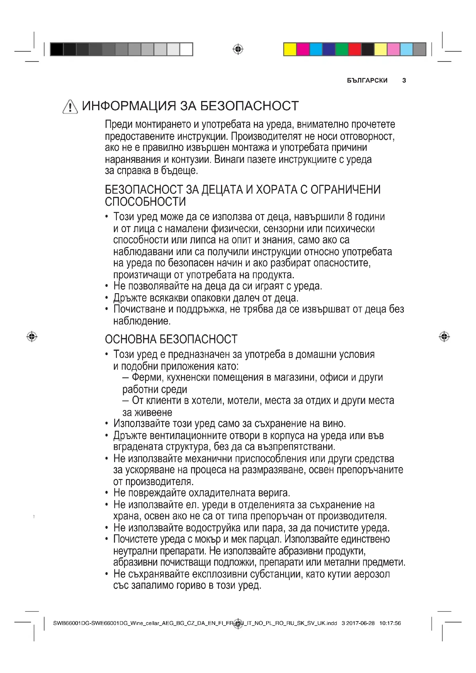 - В случай че захранващият кабел е повреден, той трябва да бъде заменен от производителя, неговия сервизен представител или лице с подобна квалификация, с цел избягване на опасности. SWB66001DG-SWE66001DG_Wine_cellar_AEG_BG_CZ_DA_EN_FI_FR_HU_IT_NO_PL_RO_RU_SK_SV_UK.indd 4 2017-06-28 10:17:565