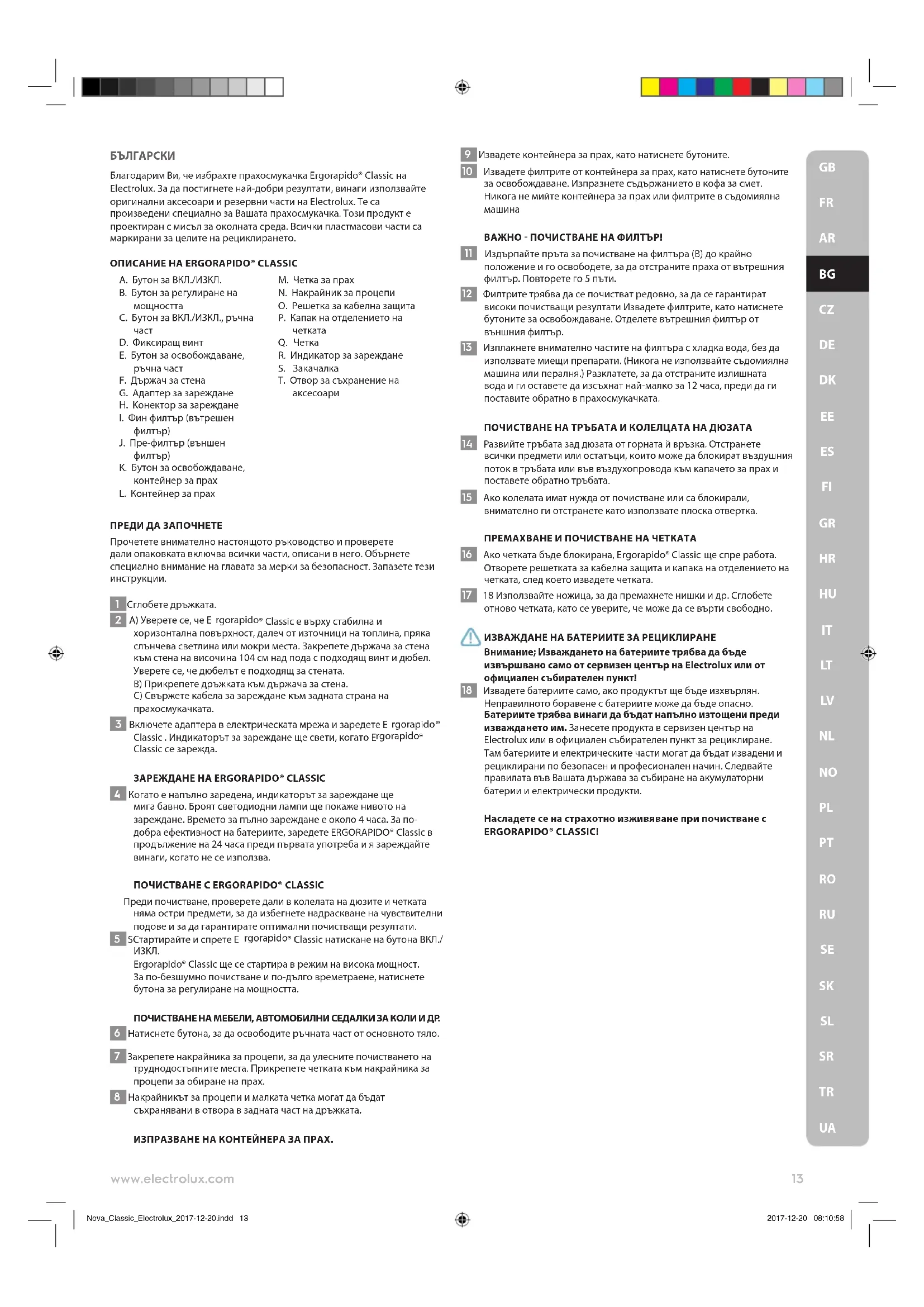 Nova_Classic_Electrolux_2017-12-20.indd 12 2017-12-20 08:10:58БЪЛГАРСКИ Благодарим Ви, че избрахте прахосмукачка Ergorapido® Classic на Electrolux. За да постигнете най-добри резултати, винаги използвайте оригинални аксесоари и резервни части на Electrolux. Те са произведени специално за Вашата прахосмукачка. Този продукт е проектиран с мисъл за околната среда. Всички пластмасови части са маркирани за целите на рециклирането. ОПИСАНИЕ НА ERGORAPIDO® CLASSIC A. Бутон за ВКЛ./ИЗКЛ. B. Бутон за регулиране на