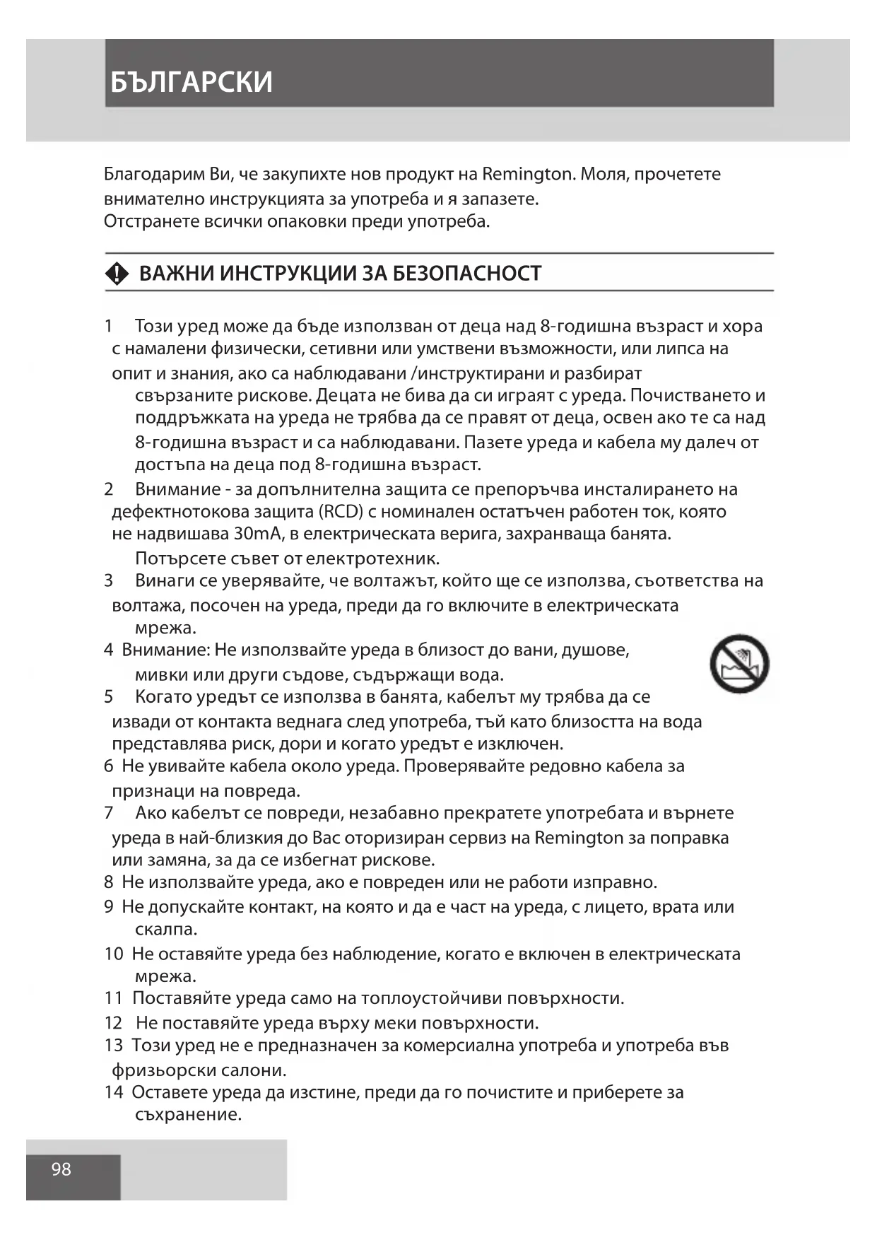 Благодарим Ви, че закупихте нов продукт на Remington. Моля, прочетете внимателно инструкцията за употреба и я запазете. Отстранете всички опаковки преди употреба. F ВАЖНИ ИНСТРУКЦИИ ЗА БЕЗОПАСНОСТ 1 Този уред може да бъде използван от деца над 8-годишна възраст и хора с намалени физически, сетивни или умствени възможности, или липса на опит и знания, ако са наблюдавани /инструктирани и разбират свързаните рискове. Децата не бива да си играят с уреда. Почистването и поддръжката на уреда не трябва да се правят от деца, освен ако те са над 8-годишна възраст и са наблюдавани. Пазете уреда и кабела му далеч от достъпа на деца под 8-годишна възраст. 2 Внимание - за допълнителна защита се препоръчва инсталирането на дефектнотокова защита (RCD) с номинален остатъчен работен ток, която не надвишава 30mA, в електрическата верига, захранваща банята. Потърсете съвет от електротехник. 3 Винаги се уверявайте, че волтажът, който ще се използва, съответства на волтажа, посочен на уреда, преди да го включите в електрическата