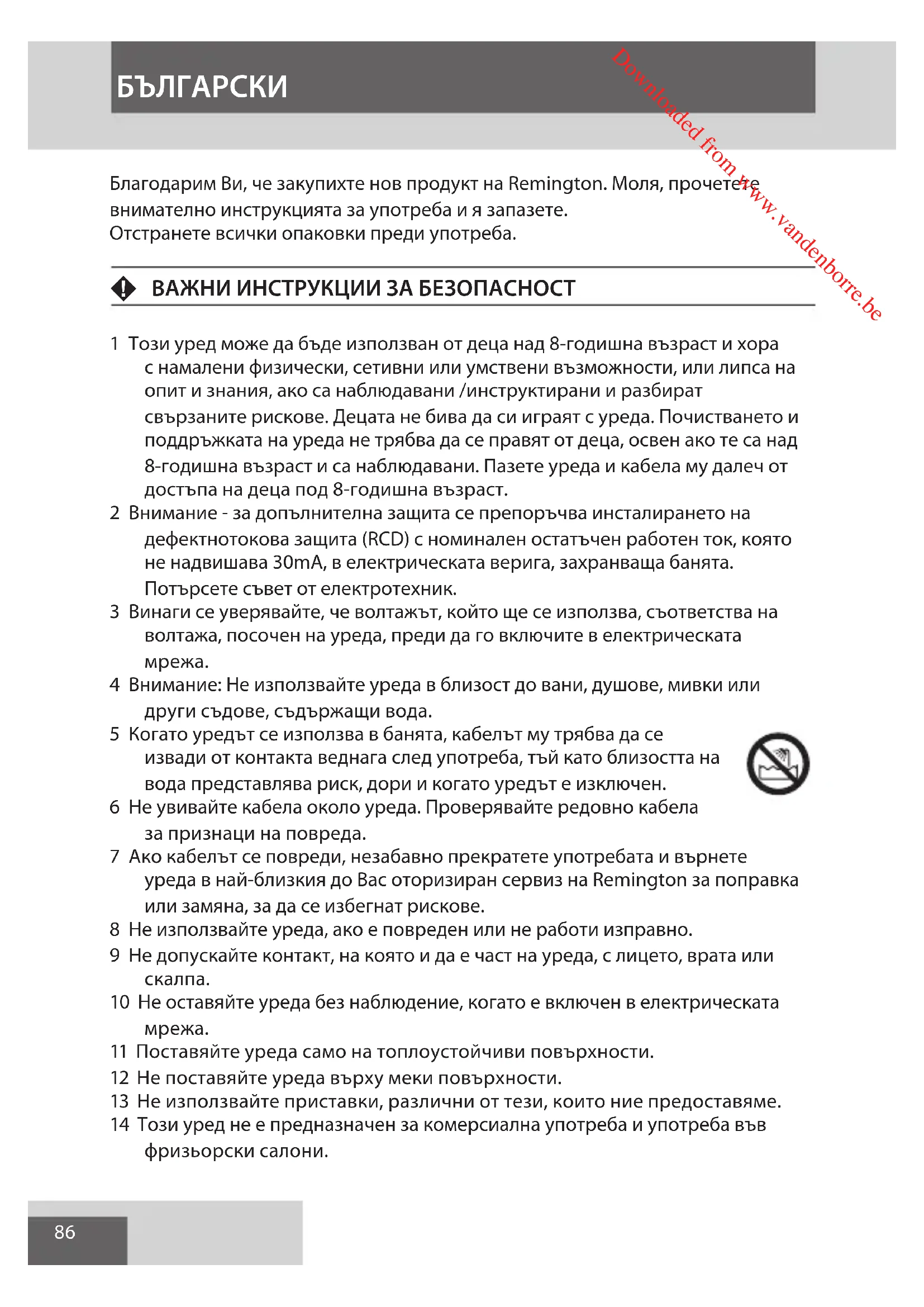 Благодарим Ви, че закупихте нов продукт на Remington. Моля, прочетете внимателно инструкцията за употреба и я запазете. Отстранете всички опаковки преди употреба. F ВАЖНИ ИНСТРУКЦИИ ЗА БЕЗОПАСНОСТ 1 Този уред може да бъде използван от деца над 8-годишна възраст и хора с намалени физически, сетивни или умствени възможности, или липса на опит и знания, ако са наблюдавани /инструктирани и разбират свързаните рискове. Децата не бива да си играят с уреда. Почистването и поддръжката на уреда не трябва да се правят от деца, освен ако те са над 8-годишна възраст и са наблюдавани. Пазете уреда и кабела му далеч от достъпа на деца под 8-годишна възраст. 2 Внимание - за допълнителна защита се препоръчва инсталирането на дефектнотокова защита (RCD) с номинален остатъчен работен ток, която не надвишава 30mA, в електрическата верига, захранваща банята. Потърсете съвет от електротехник. 3 Винаги се уверявайте, че волтажът, който ще се използва, съответства на волтажа, посочен на уреда, преди да го включите в електрическата