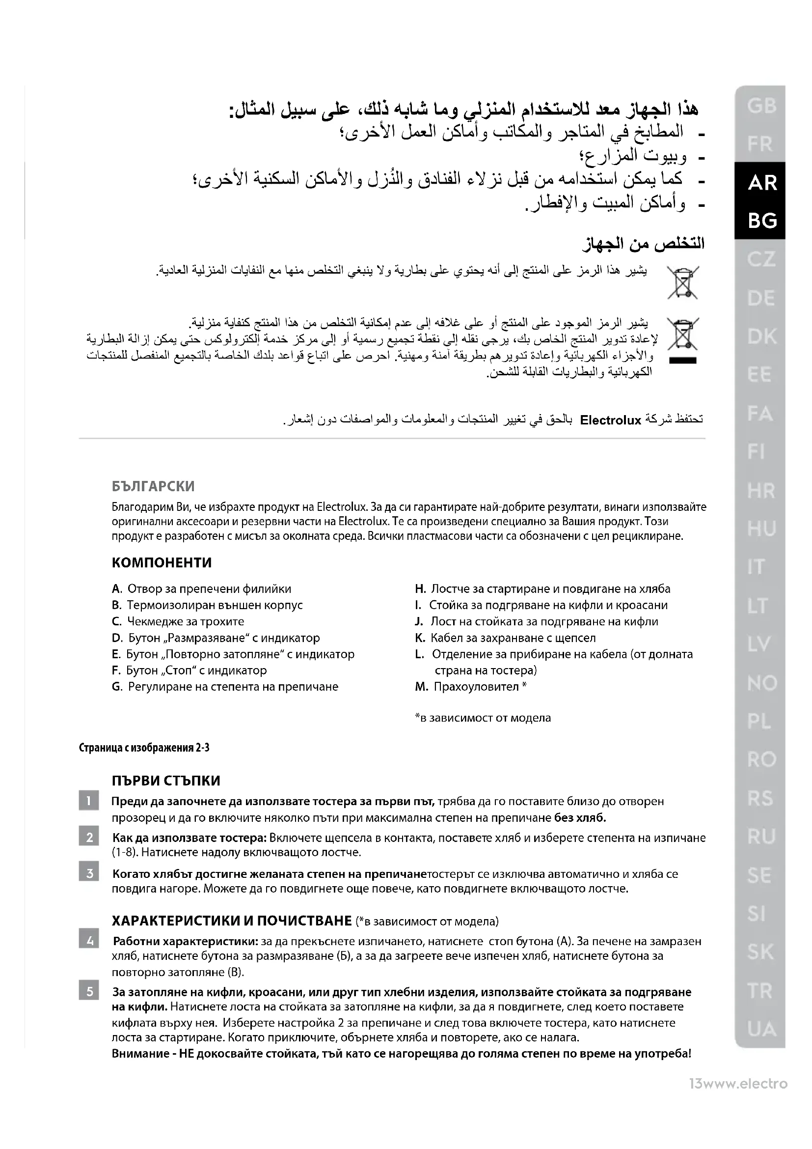 J. Лост на стойката за подгряване на кифли K. Кабел за захранване с щепсел L. Отделение за прибиране на кабела (от долната страна на тостера) M. Прахоуловител * *в зависимост от модела Страница с изображения 2-3 ПЪРВИ СТЪПКИ 1 Преди да започнете да използвате тостера за първи път, трябва да го поставите близо до отворен прозорец и да го включите няколко пъти при максимална степен на препичане без хляб. 2 Как да използвате тостера: Включете щепсела в контакта, поставете хляб и изберете степента на изпичане (1-8). Натиснете надолу включващото лостче. 3 Когато хлябът достигне желаната степен на препичанетостерът се изключва автоматично и хляба се повдига нагоре. Можете да го повдигнете още повече, като повдигнете включващото лостче. ХАРАКТЕРИСТИКИ И ПОЧИСТВАНЕ (*в зависимост от модела) 4 Работни характеристики: за да прекъснете изпичането, натиснете стоп бутона (А). За печене на замразен хляб, натиснете бутона за размразяване (Б), а за да загреете вече изпечен хляб, натиснете бутона за повторно затопляне (В). 5 За затопляне на кифли, кроасани, или друг тип хлебни изделия, използвайте стойката за подгряване на кифли. Натиснете лоста на стойката за затопляне на кифли, за да я повдигнете, след което поставете кифлата върху нея. Изберете настройка 2 за препичане и след това включете тостера, като натиснете лоста за стартиране. Когато приключите, обърнете хляба и повторете, ако се налага. Внимание - НЕ докосвайте стойката, тъй като се нагорещява до голяма степен по време на употреба!14 www.electrolux.com 6 Грижи и почистване: изключете тостера от контакта и оставете да изстине. Изпразнете чекмеджето за трохи. Избършете външната повърхност с леко влажна кърпа. Никога не използвайте разяждащи или абразивни средства за почистване и никога не потапяйте уреда във вода! Насладете се на своя нов продукт от Electrolux! УКАЗАНИЯ ЗА БЕЗОПАСНОСТ Прочетете следните инструкции внимателно преди за използвате уреда за първи път.