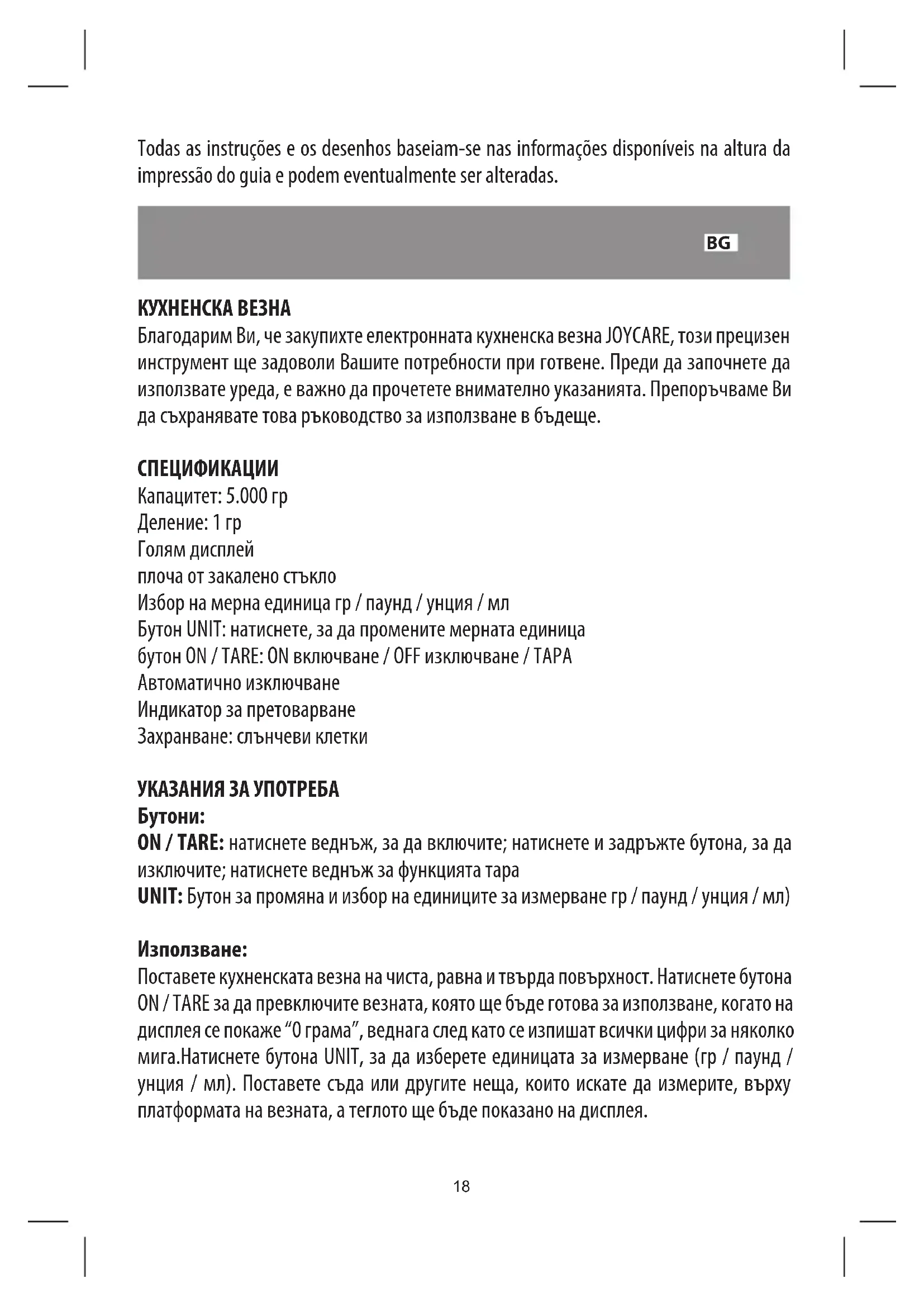 КУХНЕНСКА ВЕЗНА Благодарим Ви, че закупихте електронната кухненска везна JOYCARE, този прецизен инструмент ще задоволи Вашите потребности при готвене. Преди да започнете да използвате уреда, е важно да прочетете внимателно указанията. Препоръчваме Ви да съхранявате това ръководство за използване в бъдеще. СПЕЦИФИКАЦИИ Капацитет: 5.000 гр Деление: 1 гр Голям дисплей плоча от закалено стъкло Избор на мерна единица гр / паунд / унция / мл Бутон UNIT: натиснете, за да промените мерната единица бутон ON / ТАRE: ON включване / OFF изключване / ТАРА Автоматично изключване Индикатор за претоварване Захранване: слънчеви клетки УКАЗАНИЯ ЗА УПОТРЕБА