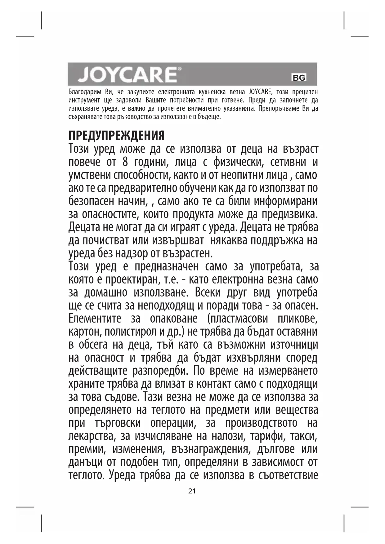Благодарим Ви, че закупихте електронната кухненска везна JOYCARE, този прецизен инструмент ще задоволи Вашите потребности при готвене. Преди да започнете да използвате уреда, е важно да прочетете внимателно указанията. Препоръчваме Ви да съхранявате това ръководство за използване в бъдеще. ПРЕДУПРЕЖДЕНИЯ Този уред може да се използва от деца на възраст повече от 8 години, лица с физически, сетивни и умствени способности, както и от неопитни лица , само ако те са предварително обучени как да го използват по безопасен начин, , само ако те са били информирани за опасностите, които продукта може да предизвика. Децата не могат да си играят с уреда. Децата не трябва да почистват или извършват някаква поддръжка на уреда без надзор от възрастен. Този уред е предназначен само за употребата, за която е проектиран, т.е. - като електронна везна само за домашно използване. Всеки друг вид употреба ще се счита за неподходящ и поради това - за опасен. Елементите за опаковане (пластмасови пликове, картон, полистирол и др.) не трябва да бъдат оставяни в обсега на деца, тъй като са възможни източници на опасност и трябва да бъдат изхвърляни според действащите разпоредби. По време на измерването храните трябва да влизат в контакт само с подходящи за това съдове. Тази везна не може да се използва за определянето на теглото на предмети или вещества при търговски операции, за производството на лекарства, за изчисляване на налози, тарифи, такси, премии, изменения, възнаграждения, дългове или данъци от подобен тип, определяни в зависимост от теглото. Уреда трябва да се използва в съответствие22