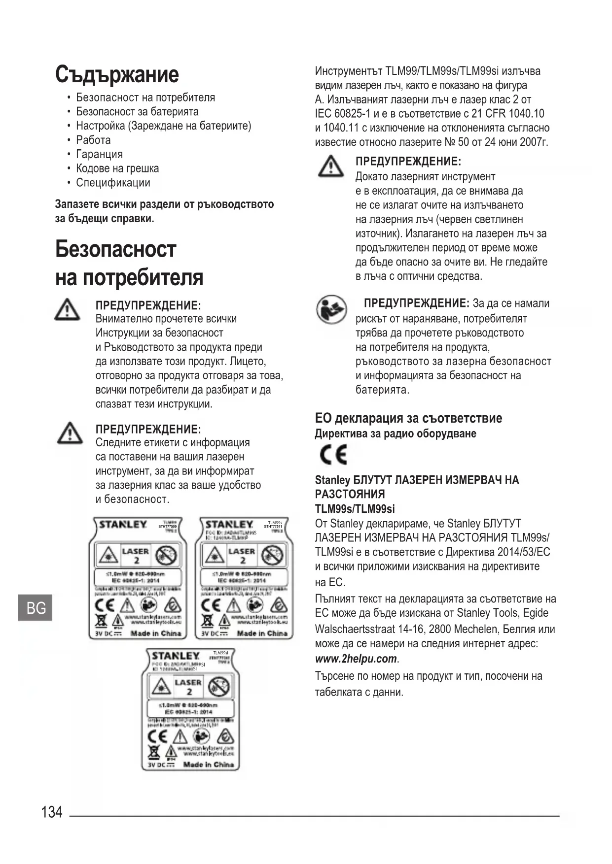 TLM99si Инструментът TLM99/TLM99s/TLM99si излъчва видим лазерен лъч, както е показано на фигура A. Излъчваният лазерни лъч е лазер клас 2 от IEC 60825-1 и е в съответствие с 21 CFR 1040.10 и 1040.11 с изключение на отклоненията съгласно известие относно лазерите № 50 от 24 юни 2007г.ПРЕДУПРЕЖДЕНИЕ:Докато лазерният инструмент е в експлоатация, да се внимава да не се излагат очите на излъчването на лазерния лъч (червен светлинен източник). Излагането на лазерен лъч за продължителен период от време може да бъде опасно за очите ви. Не гледайте в лъча с оптични средства. ПРЕДУПРЕЖДЕНИЕ: За да се намали рискът от нараняване, потребителят трябва да прочетете ръководството на потребителя на продукта, ръководството за лазерна безопасност и информацията за безопасност на батерията. ЕО декларация за съответствие Директива за радио оборудванеStanley БЛУТУТ ЛАЗЕРЕН ИЗМЕРВАЧ НА РАЗСТОЯНИЯTLM99s/TLM99siОт Stanley декларираме, че Stanley БЛУТУТ ЛАЗЕРЕН ИЗМЕРВАЧ НА РАЗСТОЯНИЯ TLM99s/TLM99si е в съответствие с Директива 2014/53/ЕС и всички приложими изисквания на директивите на ЕС.Пълният текст на декларацията за съответствие на ЕС може да бъде изискана от Stanley Tools, Egide Walschaertsstraat 14-16, 2800 Mechelen, Белгия или може да се намери на следния интернет адрес: www.2helpu.com.Търсене по номер на продукт и тип, посочени на табелката с данни.135