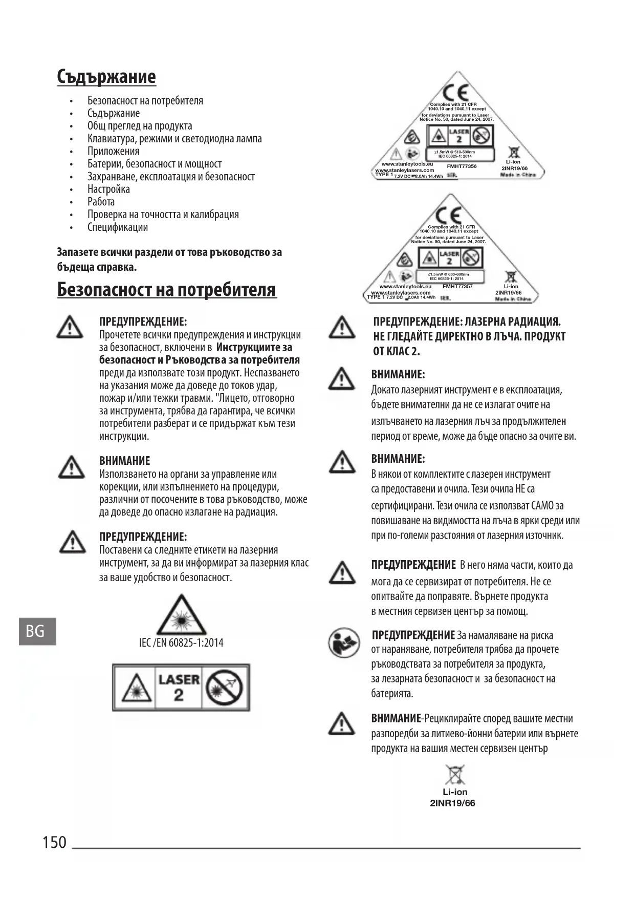 - Лазерният продукт не може да се сервизира от потребителя и трябва да се върне на дистрибутор на Сервизен/гаранционен център на Stanley, в случай на отказ или повреда. Всякакво сервизно обслужване следва да се извършва от квалифицирано лице, което използва само оригинални резервни части. Това ще осигури безопасността на продукта.153