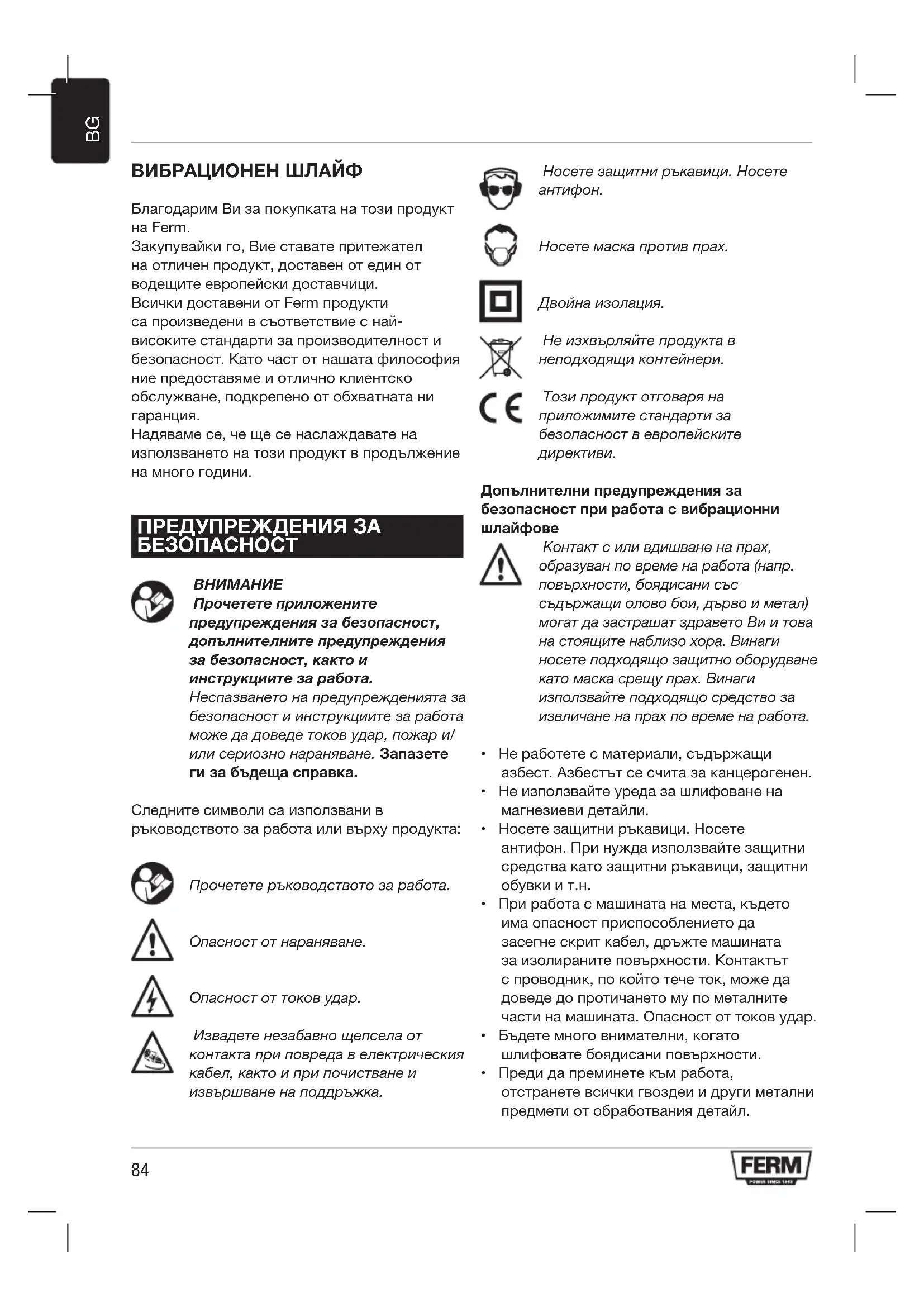 ВИБРАЦИОНЕН ШЛАЙФ Благодарим Ви за покупката на този продукт на Ferm. Закупувайки го, Вие ставате притежател на отличен продукт, доставен от един от водещите европейски доставчици. Всички доставени от Ferm продукти са произведени в съответствие с най- високите стандарти за производителност и безопасност. Като част от нашата философия ние предоставяме и отлично клиентско обслужване, подкрепено от обхватната ни