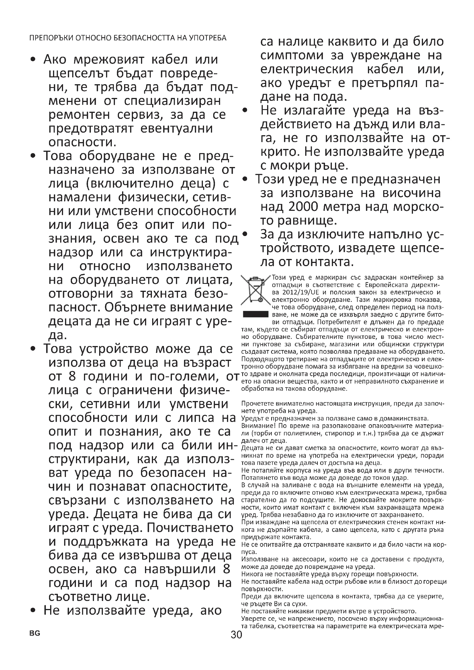 - За да изключите напълно ус- тройството, извадете щепсе- ла от контакта. Този уред е маркиран със задраскан контейнер за отпадъци в съответствие с Европейската директи- ва 2012/19/UE и полския закон за електрическо и електронно оборудване. Тази маркировка показва, че това оборудване, след определен период на полз- ване, не може да се изхвърля заедно с другите бито- ви отпадъци. Потребителят е длъжен да го предаде там, където се събират отпадъци от електрическо и електрон- но оборудване. Събирателните пунктове, в това число мест- ни пунктове за събиране, магазини или общински структури създават система, която позволява предаване на оборудването. Подходящото третиране на отпадъците от електрическо и елек- тронно оборудване помага за избягване на вредни за човешко- то здраве и околната среда последици, произтичащи от наличи- ето на опасни вещества, както и от неправилното съхранение и обработка на такова оборудване. Прочетете внимателно настоящата инструкция, преди да започ- нете употреба на уреда. Уредът е предназначен за ползване само в домакинствата. Внимание! По време на разопаковане опаковъчните материа- ли (торби от полиетилен, стиропор и т.н.) трябва да се държат далеч от деца. Децата не си дават сметка за опасностите, които могат да въз- никнат по време на употреба на електрически уреди, поради това пазете уреда далеч от достъпа на деца. Не потапяйте корпуса на уреда във вода или в други течности. Потапянето във вода може да доведе до токов удар. В случай на заливане с вода на външните елементи на уреда, преди да го включите отново към електрическата мрежа, трябва старателно да го подсушите. Не докосвайте мокрите повърх- ности, които имат контакт с включен към захранващата мрежа уред. Трябва незабавно да го изключите от захранването. При изваждане на щепсела от електрическия стенен контакт ни- кога не дърпайте кабела, а само щепсела, като с другата ръка придържате контакта. Не се опитвайте да отстранявате каквито и да било части на кор-