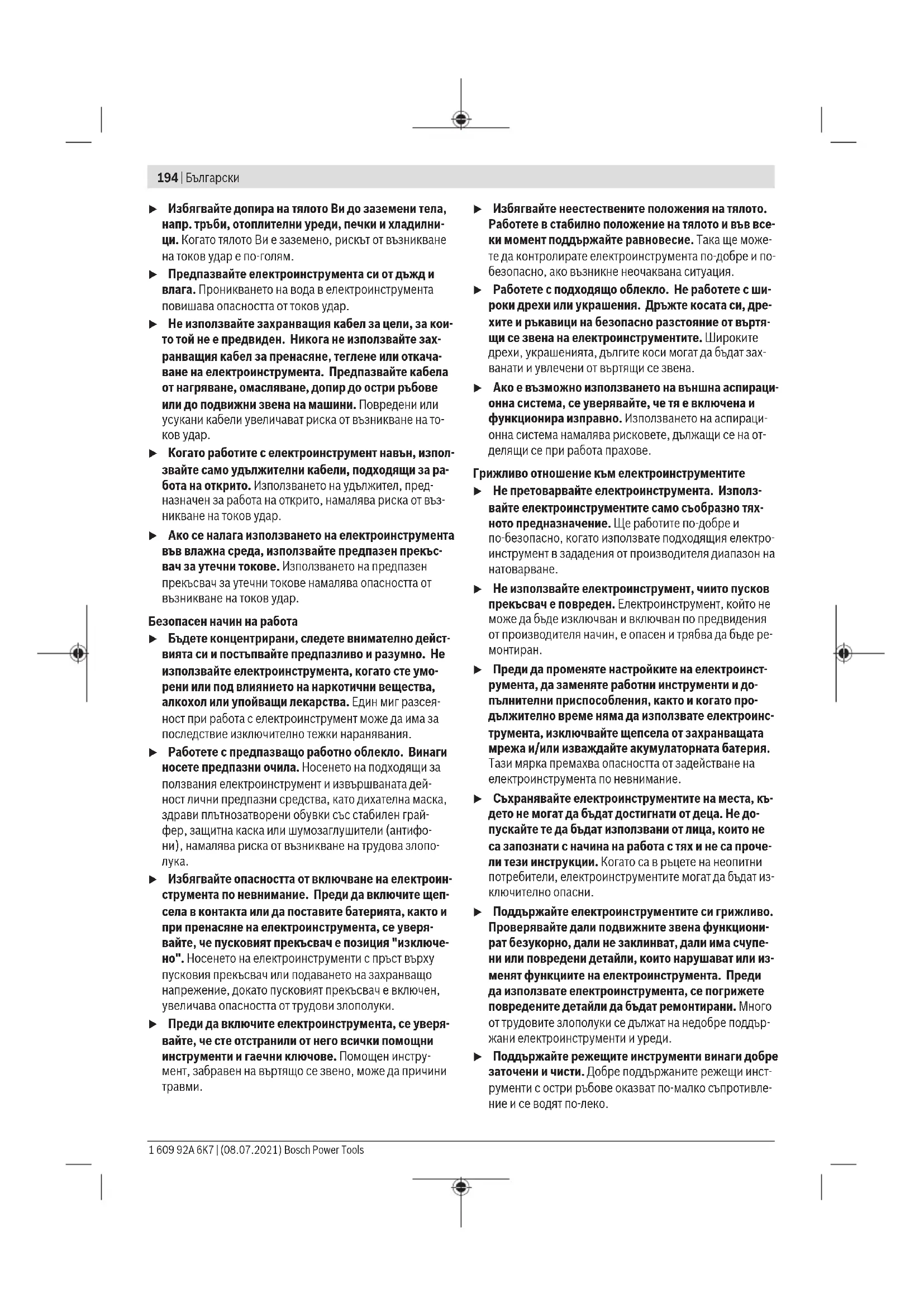 Безопасност на работното място u Пазете работното си място чисто и добре осветено. Разхвърляните или тъмни работни места са предпос- тавка за инциденти. u Не работете с електроинструмента в среда с пови- шена опасност от възникване на експлозия, в бли- зост до леснозапалими течности, газове или прахо- образни материали. По време на работа в електроин- струментите се отделят искри, които могат да възпла- менят прахообразни материали или пари. u Дръжте деца и странични лица на безопасно разсто- яние, докато работите с електроинструмента. Ако вниманието Ви бъде отклонено, може да загубите кон- трола над електроинструмента. Безопасност при работа с електрически ток u Щепселът на електроинструмента трябва да е под- ходящ за ползвания контакт. В никакъв случай не се допуска изменяне на конструкцията на щепсе- ла. Когато работите със занулени електроуреди, не използвайте адаптери за щепсела. Ползването на оригинални щепсели и контакти намалява риска от възникване на токов удар. Bosch Power Tools 1 609 92A 6K7 | (08.07.2021)194 | Български u Избягвайте допира на тялото Ви до заземени тела, напр. тръби, отоплителни уреди, печки и хладилни- ци. Когато тялото Ви е заземено, рискът от възникване на токов удар е по‑голям. u Предпазвайте електроинструмента си от дъжд и влага. Проникването на вода в електроинструмента повишава опасността от токов удар. u Не използвайте захранващия кабел за цели, за кои- то той не е предвиден. Никога не използвайте зах- ранващия кабел за пренасяне, теглене или откача- ване на електроинструмента. Предпазвайте кабела от нагряване, омасляване, допир до остри ръбове или до подвижни звена на машини. Повредени или усукани кабели увеличават риска от възникване на то-