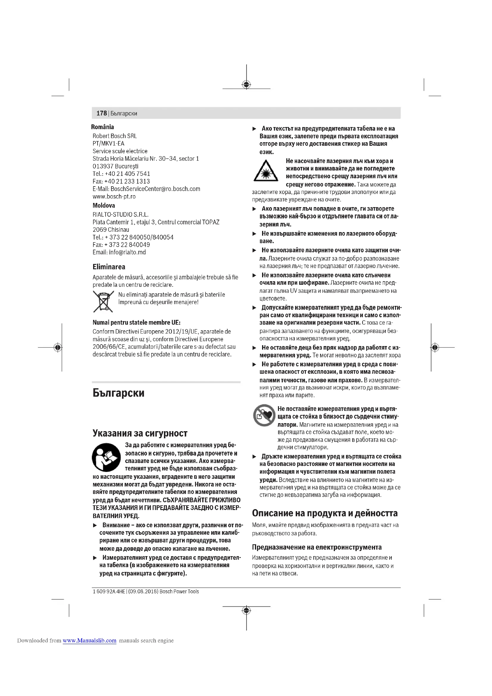 u Допускайте измервателният уред да бъде ремонти- ран само от квалифицирани техници и само с изпол- зване на оригинални резервни части. С това се га- рантира запазването на функциите, осигуряващи без- опасността на измервателния уред. u Не оставяйте деца без пряк надзор да работят с из- мервателния уред. Те могат неволно да заслепят хора u Не работете с измервателния уред в среда с пови- шена опасност от експлозии, в която има лесноза- палими течности, газове или прахове. В измервател- ния уред могат да възникнат искри, които да възпламе- нят праха или парите. Не поставяйте измервателния уред и въртя- щата се стойка в близост до сърдечни стиму- латори. Магнитите на измервателния уред и на въртящата се стойка създават поле, което мо- же да предизвика смущения в работата на сър- дечни стимулатори. u Дръжте измервателния уред и въртящата се стойка на безопасно разстояние от магнитни носители на информация и чувствителни към магнитни полета уреди. Вследствие на влиянието на магнитите на из- мервателния уред и на въртящата се стойка може да се стигне до невъзвратима загуба на информация. Описание на продукта и дейността Моля, имайте предвид изображенията в предната част на ръководството за работа. Предназначение на електроинструмента Измервателният уред е предназначен за определяне и проверка на хоризонтални и вертикални линии, както и на пети на отвеси. România Downloaded from www.Manualslib.com manuals search engineИзмервателният уред е подходящ за работа на открито и в затворени помещения. Изобразени елементи Номерирането на елементите се отнася до изображение- то на измервателния уред на страницата с фигурите. (1) Отвор за изходящия лазерен лъч (2) Състояние на батерията (3) Светлинен индикатор за работа без автоматич- но нивелиране (4) Бутон за режим лазерна точка (5) Бутон за режим лазерна линия (6) Капак на гнездото за батерии (7) Канал за позициониране (8) Пусков прекъсвач (9) Гнездо за монтиране към статив 1/4" (10) Гнездо за монтиране към статив 5/8" (11) Сериен номер (12) Предупредителна табелка за лазерния лъч (13) Въртяща се стойка (RM1) (14) Направляваща шина (15) Надлъжен присъединителен отвор (16)