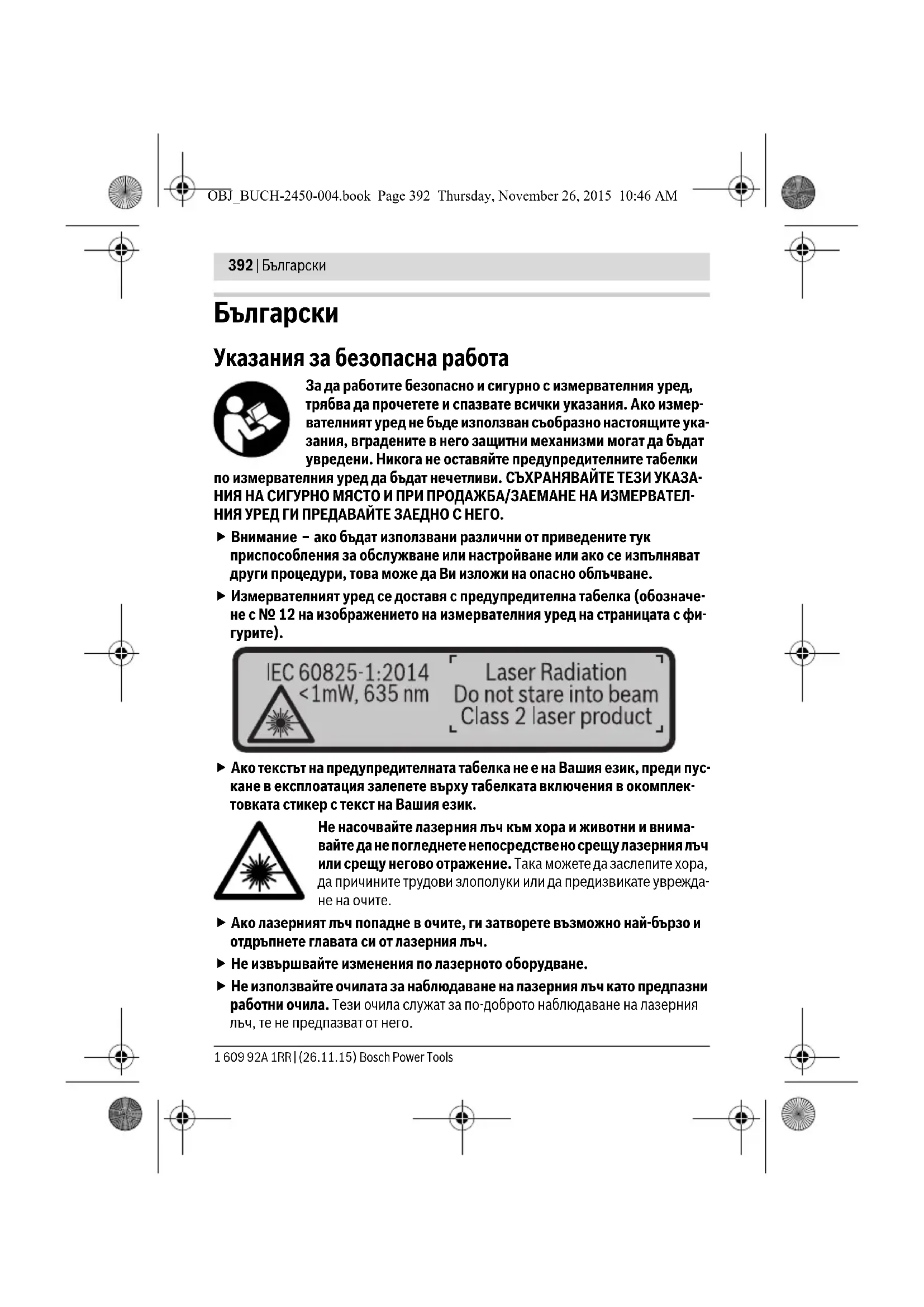 не на очите. Ако лазерният лъч попадне в очите, ги затворете възможно най-бързо и отдръпнете главата си от лазерния лъч. Не извършвайте изменения по лазерното оборудване. Не използвайте очилата за наблюдаване на лазерния лъч като предпазни работни очила. Тези очила служат за по-доброто наблюдаване на лазерния лъч, те не предпазват от него. OBJ_BUCH-2450-004.book Page 392 Thursday, November 26, 2015 10:46 AMБългарски | 393 Bosch Power Tools 1 609 92A 1RR | (26.11.15) Не използвайте очилата за наблюдаване на лазерния лъч като слънчеви очила или докато участвате в уличното движение. Очилата за наблюдаване на лазерния лъч не осигуряват защита от ултравиолетовите лъчи и огранича- ват възприемането на цветовете. Допускайте измервателният уред да бъде ремонтиран само от квалифи- цирани техници и само с използване на оригинални резервни части. С това се гарантира запазването на функциите, осигуряващи безопасността на измервателния уред. Не оставяйте деца без пряк надзор да работят с измервателния уред. Мо- гат неволно да заслепят други хора. Не работете с из мервателния уред в среда с повишена опасност от екс- плозии, в която има леснозапалими течности, газове или прахове. В из- мервателния уред могат да възникнат искри, които да възпламенят праха или