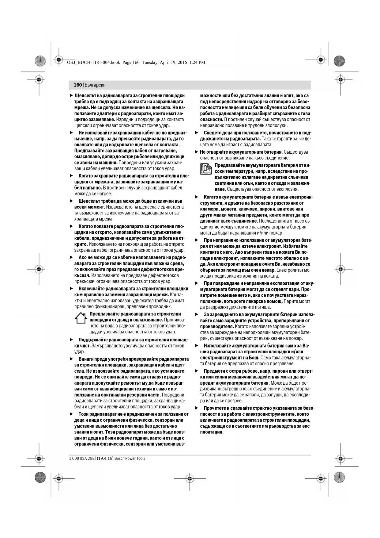 Recepţie radio slabă Perturbare provocată de alte aparate sau amplasament ne- favorabil Amplasaţi radioul de şantier în altă locaţie cu o recepţie mai bună, respectiv la o dis- tanţă mai mare de alte apara- te electronice sau prize de cu- rent Afişajul orei exacte deranjat Bateriile tampon pentru ceas sunt descărcate Înlocuiţi bateriile tampon Bateriile tampon au fost intro- duse cu polaritate greşită Introduceţi bateriile tampon cu polaritatea corectă Cauză Remediere OBJ_BUCH-1181-004.book Page 159 Tuesday, April 19, 2016 1:24 PM160 | Български 1 609 92A 2NE | (19.4.16) Bosch Power Tools Щепселът на радиоапарата за строителни площадки трябва да е подходящ за контакта на захранващата мрежа. Не се допуска изменение на щепсела. Не из- ползвайте адаптери с радиоапарати, които имат за- щитно заземяване. Изрядни и подходящи за контакта щепсели ограничават опасността от токов удар. Не използвайте захранващия кабел не по предназ- начение, напр. за да пренасяте радиоапарата, да го окачвате или да издърпвате щепсела от контакта. Предпазвайте захранващия кабел от нагряване, омасляване, допир до остри ръбове или до движещи се звена на машини. Повредени или усукани захран- ващи кабели увеличават опасността от токов удар. Когато захранвате радиоапарата за строителни пло- щадки от мрежата, развивайте захранващия му ка- бел напълно. В противен случай захранващият кабел може да се нагрее. Щепселът трябва да може да бъде изключен във всеки момент. Изваждането на щепсела е единствена- та възможност за изключване на радиоапарата от за- хранващата мрежа. Когато ползвате радиоапарата за строителни пло- щадки на открито, използвайте само удължителни кабели, предназначени и допуснати за работа на от- крито. Използването на подходящ за работа на открито захранващ кабел ограничава опасността от токов удар. Ако не може да се избегне използването на радио- апарата за строителни площадки във влажна среда, го включвайте през предпазен дефектнотоков пре- късвач. Използването на предпазен дефектнотоков прекъсвач ограничава опасността от токов удар. Включвайте радиоапарата за строителни площадки към правилно заземени захранващи мрежи. Конта- ктът и евентуално използван удължител трябва да имат правилно функционира щ предпазен проводник. Предпазвайте радиоапарата за строителни площадки от дъжд и овлажняване. Прониква- нето на вода в радиоапарата за строителни пло- щадки увеличава опасността от токов удар. Поддържайте радиоапарата за строителни площад- ки чист. Замърсяването увеличава опасността от токов