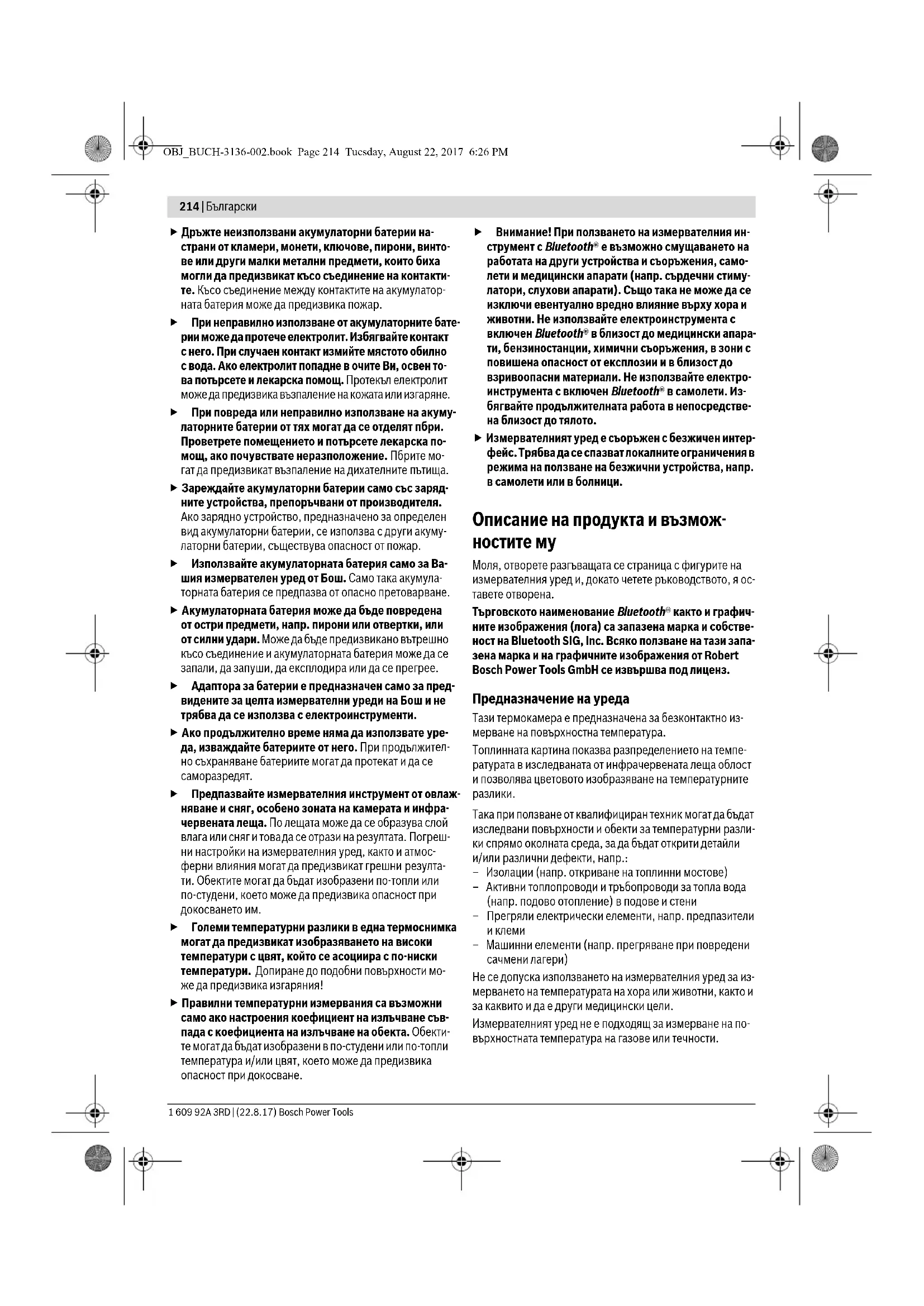 хническите параметри са определени с акумулаторната батерия, включена в окомплектовката. OBJ_BUCH-3136-002.book Page 215 Tuesday, August 22, 2017 6:26 PM216 | Български 1 609 92A 3RD | (22.8.17) Bosch Power Tools