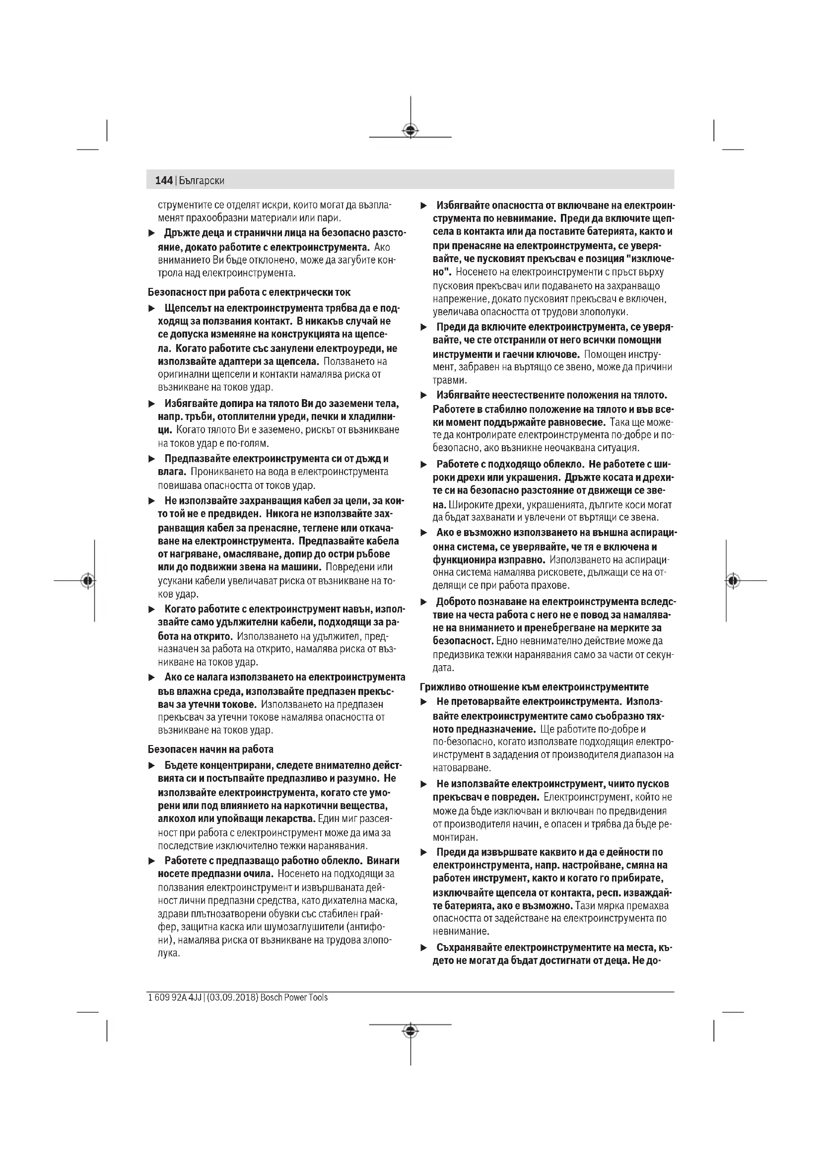 Безопасност на работното място u Пазете работното си място чисто и добре осветено. Разхвърляните или тъмни работни места са предпос- тавка за инциденти. u Не работете с електроинструмента в среда с пови- шена опасност от възникване на експлозия, в бли- зост до леснозапалими течности, газове или прахо- образни материали. По време на работа в електроин- Български | 143 Bosch Power Tools 1 609 92A 4JJ | (03.09.2018)144 | Български 1 609 92A 4JJ | (03.09.2018) Bosch Power Tools струментите се отделят искри, които могат да възпла- менят прахообразни материали или пари. u Дръжте деца и странични лица на безопасно разсто- яние, докато работите с електроинструмента. Ако вниманието Ви бъде отклонено, може да загубите кон- трола над електроинструмента. Безопасност при работа с електрически ток u Щепселът на електроинструмента трябва да е под- ходящ за ползвания контакт. В никакъв случай не се допуска изменяне на конструкцията на щепсе- ла. Когато работите със занулени електроуреди, не използвайте адаптери за щепсела. Ползването на оригинални щепсели и контакти намалява риска от възникване на токов удар. u Избягвайте допира на тялото Ви до заземени тела, напр. тръби, отоплителни уреди, печки и хладилни- ци. Когато тялото Ви е заземено, рискът от възникване на токов удар е по‑голям. u Предпазвайте електроинструмента си от дъжд и влага. Проникването на вода в електроинструмента повишава опасността от токов удар. u Не използвайте захранващия кабел за цели, за кои- то той не е предвиден. Никога не използвайте зах- ранващия кабел за пренасяне, теглене или откача- ване на електроинструмента. Предпазвайте кабела от нагряване, омасляване, допир до остри ръбове или до подвижни звена на машини. Повредени или усукани кабели увеличават риска от възникване на то-
