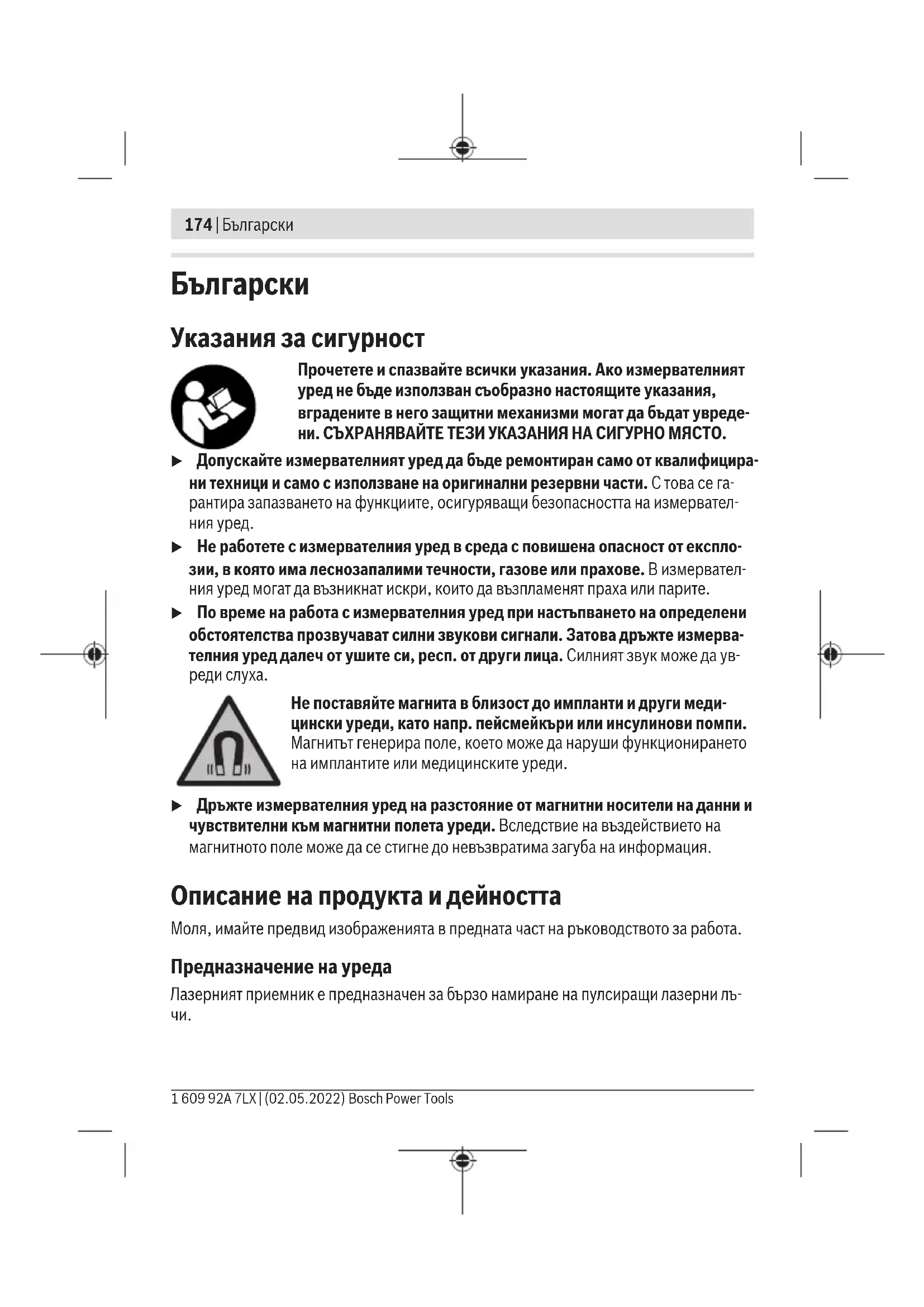 u Не работете с измервателния уред в среда с повишена опасност от експло- зии, в която има леснозапалими течности, газове или прахове. В измервател- ния уред могат да възникнат искри, които да възпламенят праха или парите. u По време на работа с измервателния уред при настъпването на определени обстоятелства прозвучават силни звукови сигнали. Затова дръжте измерва- телния уред далеч от ушите си, респ. от други лица. Силният звук може да ув- реди слуха. Не поставяйте магнита в близост до импланти и други меди- цински уреди, като напр. пейсмейкъри или инсулинови помпи. Магнитътгенерира поле, което може да наруши функционирането на имплантите или медицинските уреди. u Дръжте измервателния уред на разстояние от магнитни носители на данни и чувствителни към магнитни полета уреди. Вследствие на въздействието на магнитното поле може да се стигне до невъзвратима загуба на информация. Описание на продукта и дейността Моля, имайте предвид изображенията в предната част на ръководството за работа. Предназначение на уреда Лазерният приемник е предназначен за бързо намиране на пулсиращи лазерни лъ-
