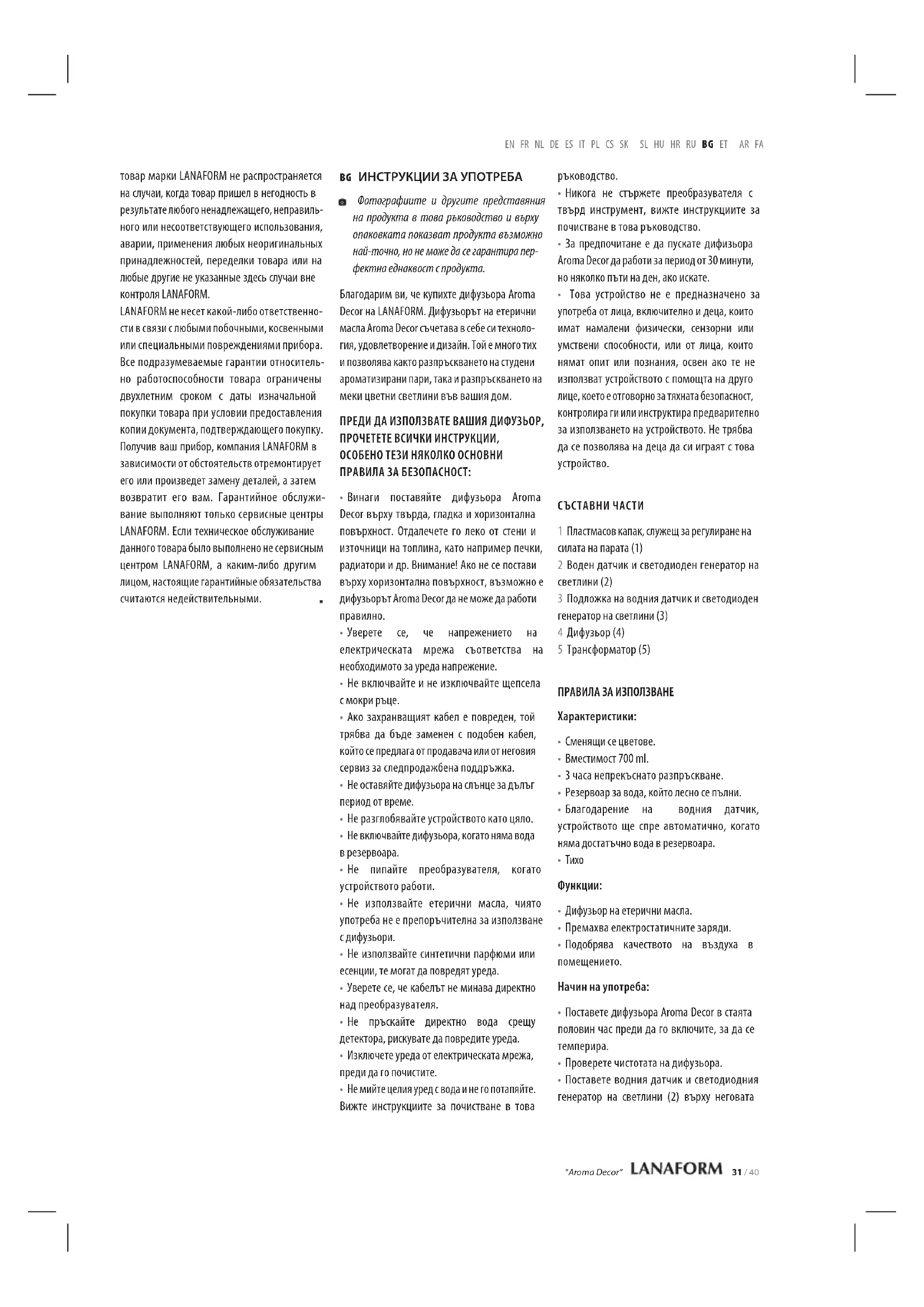РЪКОВОДСТВО ЗА ПОТРЕБИТЕЛЯ Aroma Decor LANAFORM