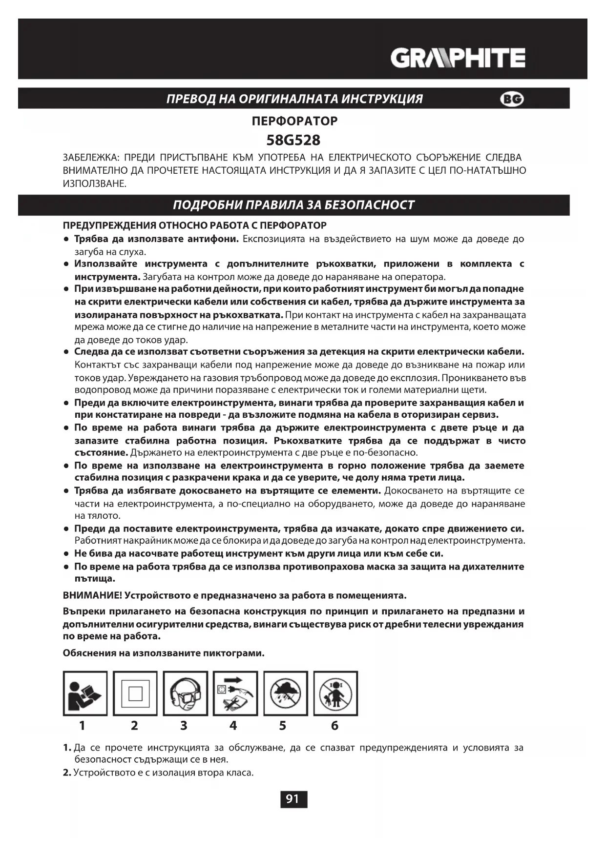 58G528 ЗАБЕЛЕЖКА: ПРЕДИ ПРИСТЪПВАНЕ КЪМ УПОТРЕБА НА ЕЛЕКТРИЧЕСКОТО СЪОРЪЖЕНИЕ СЛЕДВА ВНИМАТЕЛНО ДА ПРОЧЕТЕТЕ НАСТОЯЩАТА ИНСТРУКЦИЯ И ДА Я ЗАПАЗИТЕ С ЦЕЛ ПО-НАТАТЪШНО ИЗПОЛЗВАНЕ. ПОДРОБНИ ПРАВИЛА ЗА БЕЗОПАСНОСТ ПРЕДУПРЕЖДЕНИЯ ОТНОСНО РАБОТА С ПЕРФОРАТОР ● Трябва да използвате антифони. Експозицията на въздействието на шум може да доведе до загуба на слуха. ● Използвайте инструмента с допълнителните ръкохватки, приложени в комплекта с инструмента. Загубата на контрол може да доведе до нараняване на оператора. ● При извършване на работни дейности, при които работният инструмент би могъл да попадне на скрити електрически кабели или собствения си кабел, трябва да държите инструмента за изолираната повърхност на ръкохватката. При контакт на инструмента с кабел на захранващата мрежа може да се стигне до наличие на напрежение в металните части на инструмента, което може да доведе до токов удар. ● Следва да се използват съответни съоръжения за детекция на скрити електрически кабели. Контактът със захранващи кабели под напрежение може да доведе до възникване на пожар или токов удар. Увреждането на газовия тръбопровод може да доведе до експлозия. Проникването във водопровод може да причини поразяване с електрически ток и големи материални щети. ● Преди да включите електроинструмента, винаги трябва да проверите захранващия кабел и при констатиране на повреди - да възложите подмяна на кабела в оторизиран сервиз. ● По време на работа винаги трябва да държите електроинструмента с двете ръце и да запазите стабилна работна позиция. Ръкохватките трябва да се поддържат в чисто състояние. Държането на електроинструмента с две ръце е по-безопасно. ● По време на използване на електроинструмента в горно положение трябва да заемете стабилна позиция с разкрачени крака и да се уверите, че долу няма трети лица. ● Трябва да избягвате докосването на въртящите се елементи. Докосването на въртящите се части на електроинструмента, а по-специално на оборудването, може да доведе до нараняване