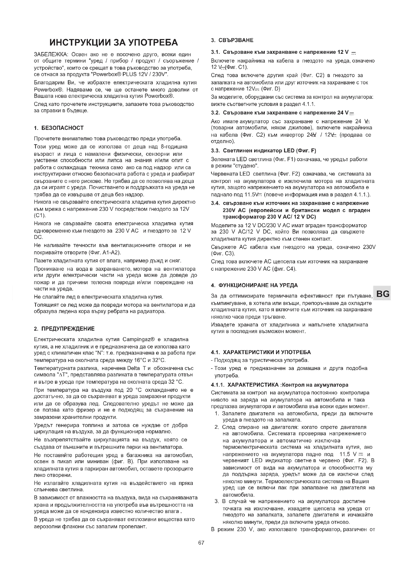 точката на изключване, извадете щепсела на уреда от гнездото на запалката, запалете двигателя и изчакайте няколко минути, преди да включите уреда отново. В режим 230 V, ако използвате трансформатор, различен от ИНСТРУКЦИИ ЗА УПОТРЕБА ЗАБЕЛЕЖКА: Освен ако не е посочено друго, всеки един от общите термини "уред / прибор / продукт / съоръжение / устройство", които се срещат в това ръководство за употреба, се отнася за продукта "Powerbox® PLUS 12V / 230V". Благодарим Ви, че избрахте електрическата хладилна кутия Powerbox®. Надяваме се, че ще останете много доволни от Вашата нова електрическа хладилна кутия Powerbox®. След като прочетете инструкциите, запазете това ръководство за справки в бъдеще.