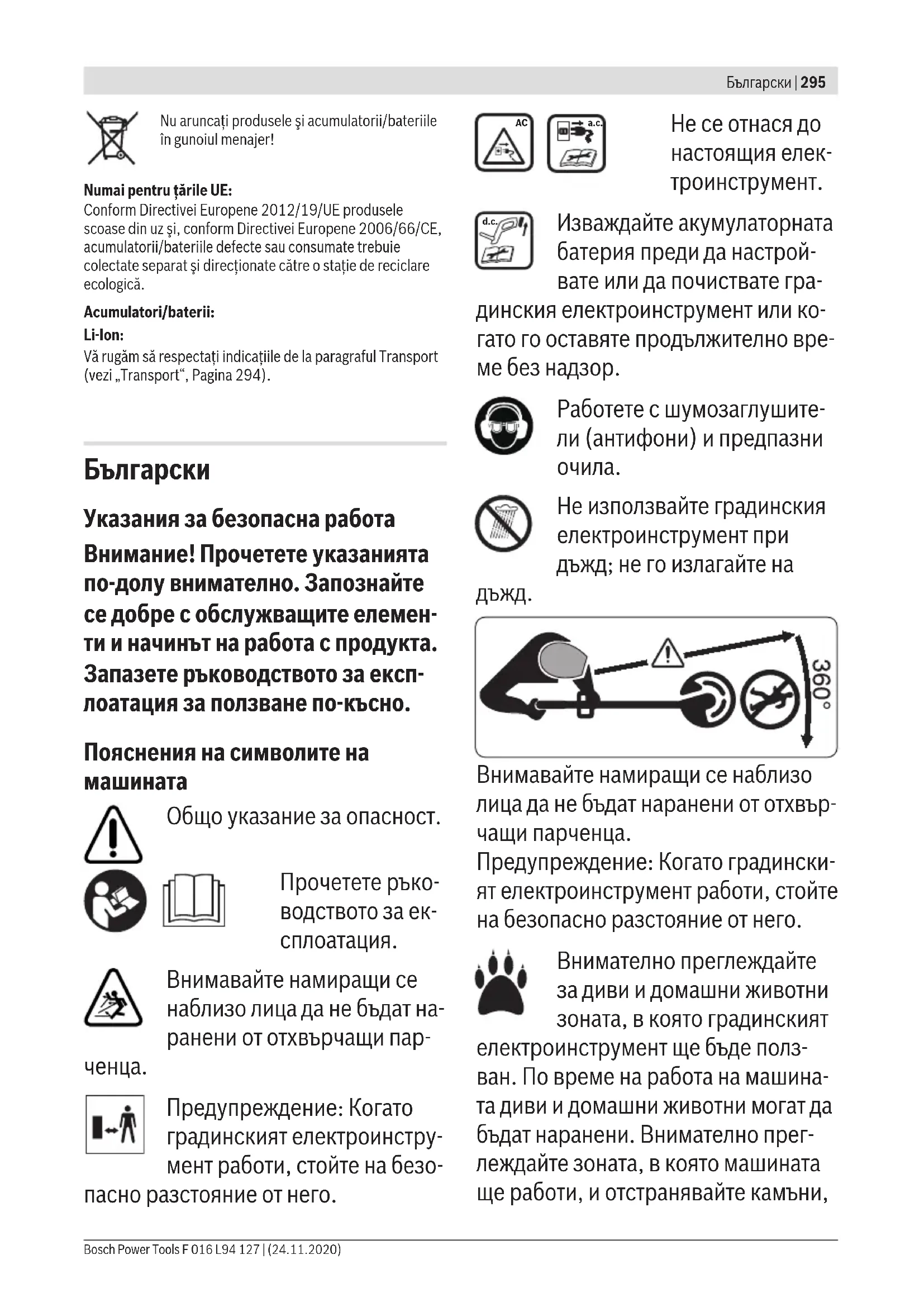 u Лицето, което обслужва машината, трябва да го ползва само съобраз- но предназначението му. При това трябва да се отчитат особеностите на конкретната ситуация. Обръ- щайте специално внимание да предпазвате намиращи се наблизо лица, особено деца. u Не допускайте тази машина да бъ- де ползвана от деца, лица с ограни- чени физически, сензорни или ду- шевни способности или лица с не- достатъчни познания и опит и/или лица, които не са запознати с тези указания. Възможно е национални F 016 L94 127 | (24.11.2020) Bosch Power ToolsБългарски | 301 нормативни документи да ограни- чават възрастта на работещия с градинския електроинструмент. u Деца трябва да бъдат под постоя- нен надзор, за да се предотврати опасността да играят с градинския електроинструмент.
