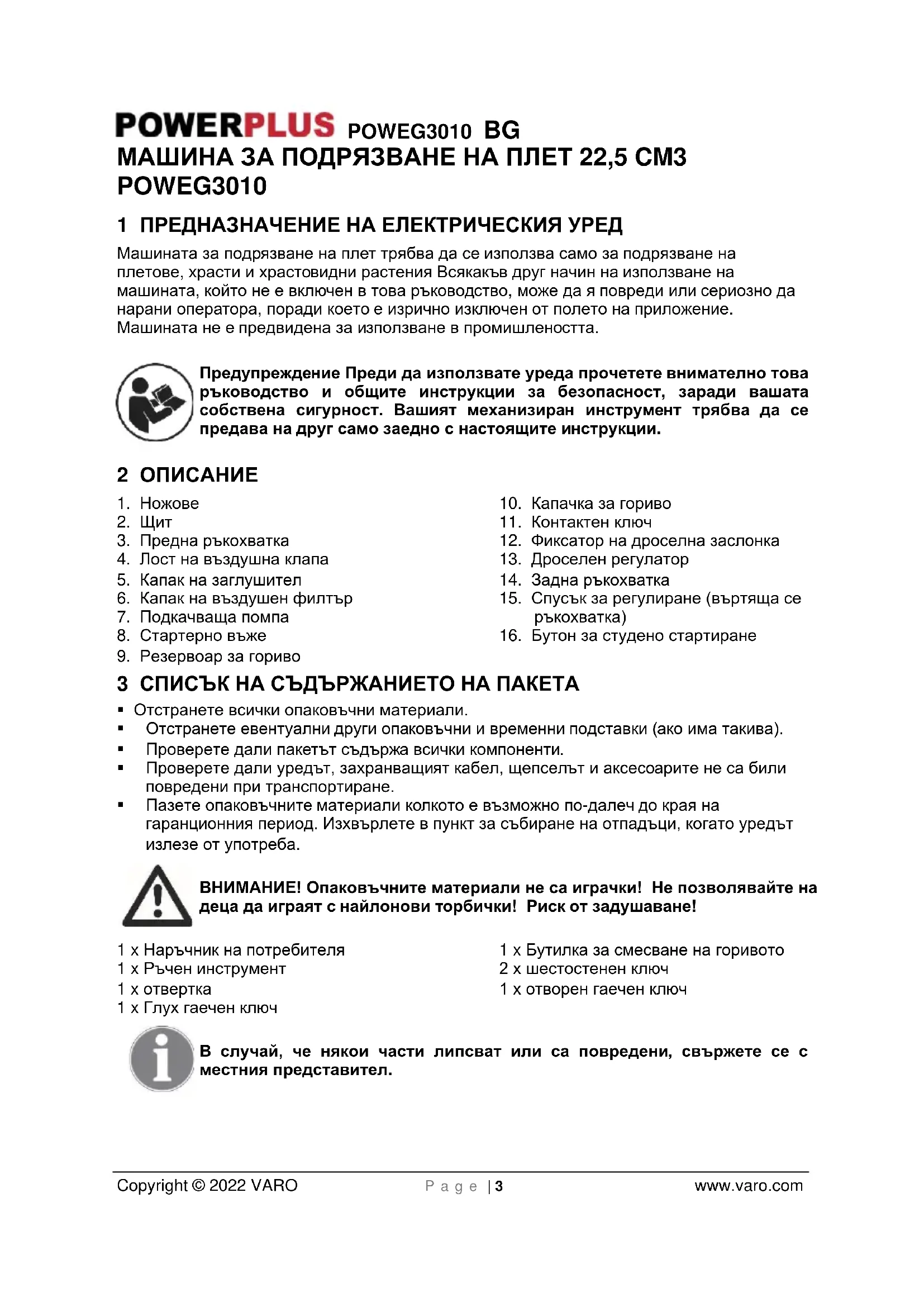 - Пазете опаковъчните материали колкото е възможно по-далеч до края на гаранционния период. Изхвърлете в пункт за събиране на отпадъци, когато уредът излезе от употреба. ВНИМАНИЕ! Опаковъчните материали не са играчки! Не позволявайте на деца да играят с найлонови торбички! Риск от задушаване! 1 x Наръчник на потребителя 1 x Ръчен инструмент 1 x отвертка 1 x Глух гаечен ключ 1 x Бутилка за смесване на горивото 2 x шестостенен ключ 1 x отворен гаечен ключ В случай, че някои части липсват или са повредени, свържете се с местния представител.POWEG3010 BG Copyright © 2022 VARO P a g e | 4 www.varo.com 4 СИМВОЛИ В настоящия наръчник и/или върху машината са използвани следните символи: