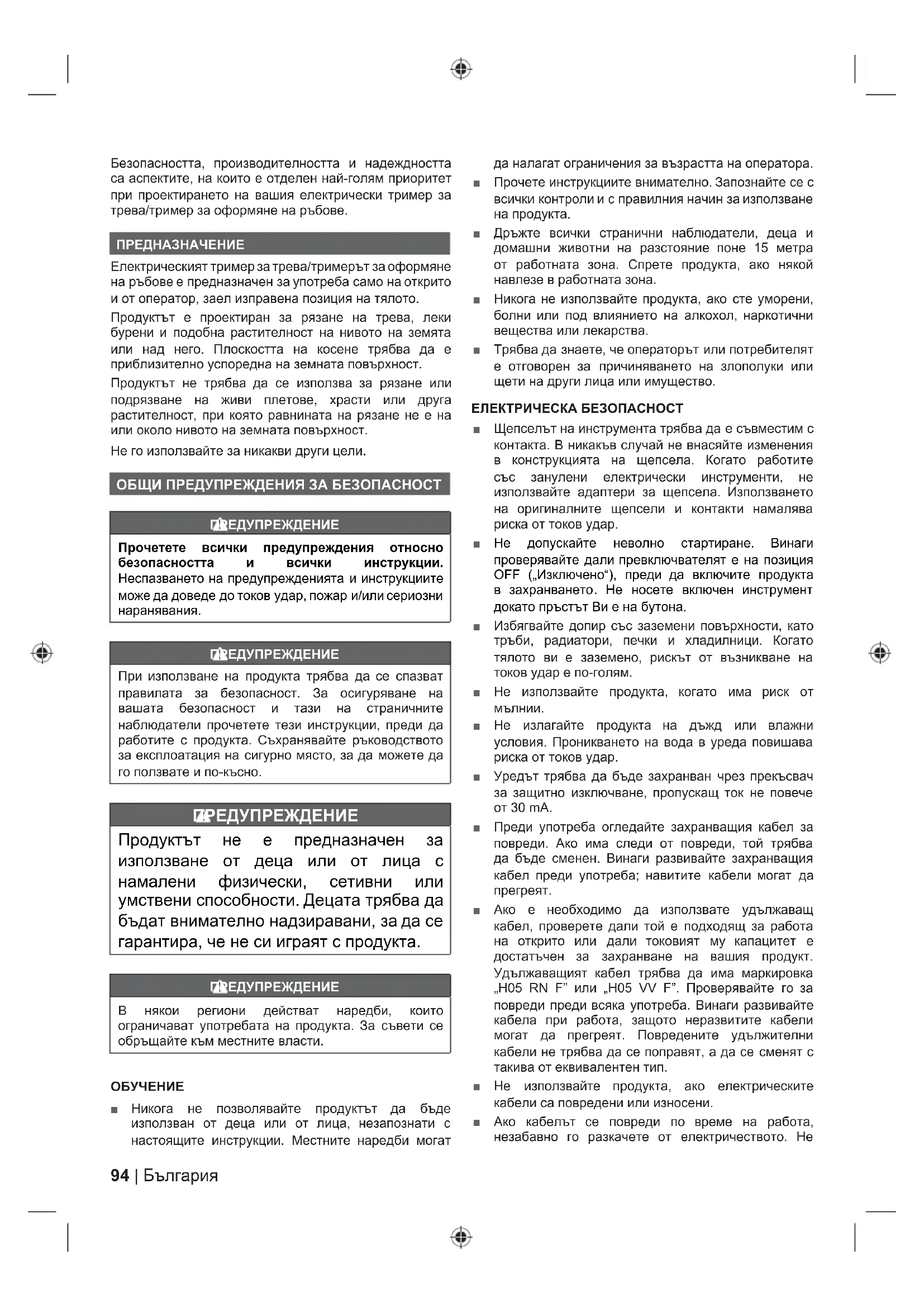 Pripojte do elektrickej zásuvky Odpojte z elektrickej zásuvky Diely alebo príslušenstvo predávané samostatne Poznámka Varovanie94 | България Безопасността, производителността и надеждността са аспектите, на които е отделен най-голям приоритет при проектирането на вашия електрически тример за трева/тример за оформяне на ръбове. ПРЕДНАЗНАЧЕНИЕ Електрическият тример за трева/тримерът за оформяне на ръбове е предназначен за употреба само на открито и от оператор, заел изправена позиция на тялото. Продуктът е проектиран за рязане на трева, леки бурени и подобна растителност на нивото на земята или над него. Плоскостта на косене трябва да е приблизително успоредна на земната повърхност. Продуктът не трябва да се използва за рязане или подрязване на живи плетове, храсти или друга растителност, при която равнината на рязане не е на или около нивото на земната повърхност. Не го използвайте за никакви други цели. ОБЩИ ПРЕДУПРЕЖДЕНИЯ ЗА БЕЗОПАСНОСТ ПРЕДУПРЕЖДЕНИЕ Прочетете всички предупреждения относно безопасността и всички инструкции. Неспазването на предупрежденията и инструкциите може да доведе до токов удар, пожар и/или сериозни наранявания. ПРЕДУПРЕЖДЕНИЕ При използване на продукта трябва да се спазват правилата за безопасност. За осигуряване на вашата безопасност и тази на страничните наблюдатели прочетете тези инструкции, преди да работите с продукта. Съхранявайте ръководството за експлоатация на сигурно място, за да можете да го ползвате и по-късно. ПРЕДУПРЕЖДЕНИЕ Продуктът не е предназначен за използване от деца или от лица с намалени физически, сетивни или умствени способности. Децата трябва да бъдат внимателно надзиравани, за да се гарантира, че не си играят с продукта. ПРЕДУПРЕЖДЕНИЕ В някои региони действат наредби, които ограничават употребата на продукта. За съвети се обръщайте към местните власти.