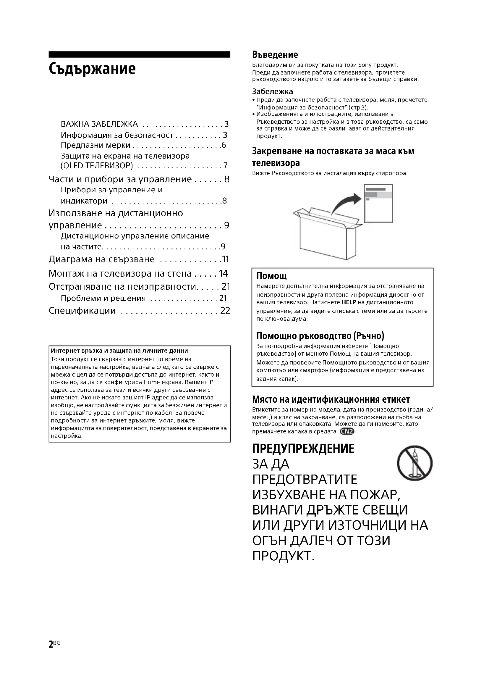 Интернет връзка и защита на личните данниТози продукт се свързва с интернет по време на първоначалната настройка, веднага след като се свърже с мрежа с цел да се потвърди достъпа до интернет, както и по-късно, за да се конфигурира Home екранa. Вашият IP адрес се използва за тези и всички други свързвания с интернет. Ако не искате вашият IP адрес да се използва изобщо, не настройвайте функцията за безжичен интернет и не свързвайте уреда с интернет по кабел. За повече подробности за интернет връзките, моля, вижте информацията за поверителност, представена в екраните за настройка. Намерете допълнителна информация за отстраняване на неизправности и друга полезна информация директно от вашия телевизор. Натиснете HELP на дистанционното управление, за да видите списъка с теми или за да търсите по ключова дума. Помощно ръководство (Ръчно) За по-подробна информация изберете [Помощно ръководство] от менюто Помощ на вашия телевизор. Можете да проверите Помощното ръководство и от вашия компютър или смартфон (информация е предоставена на задния капак).3